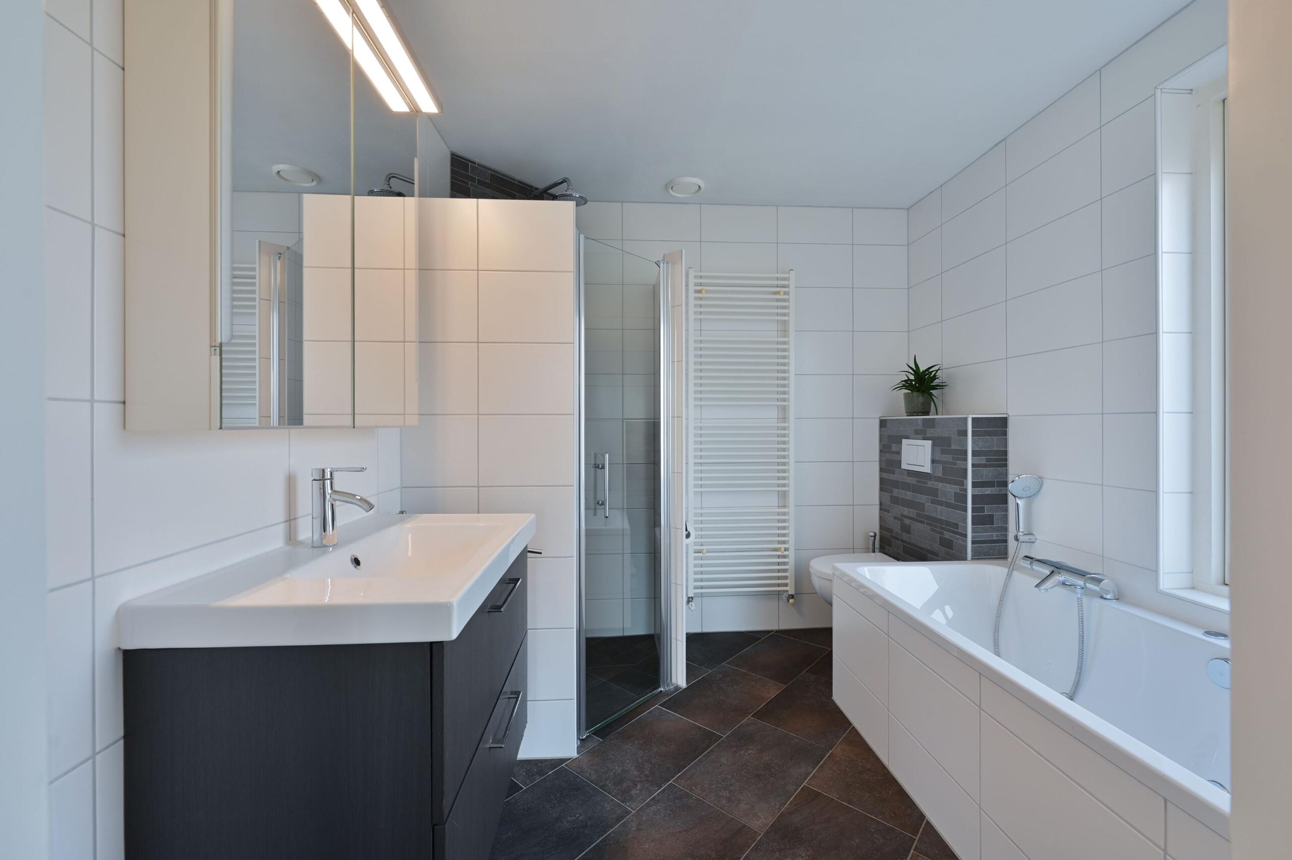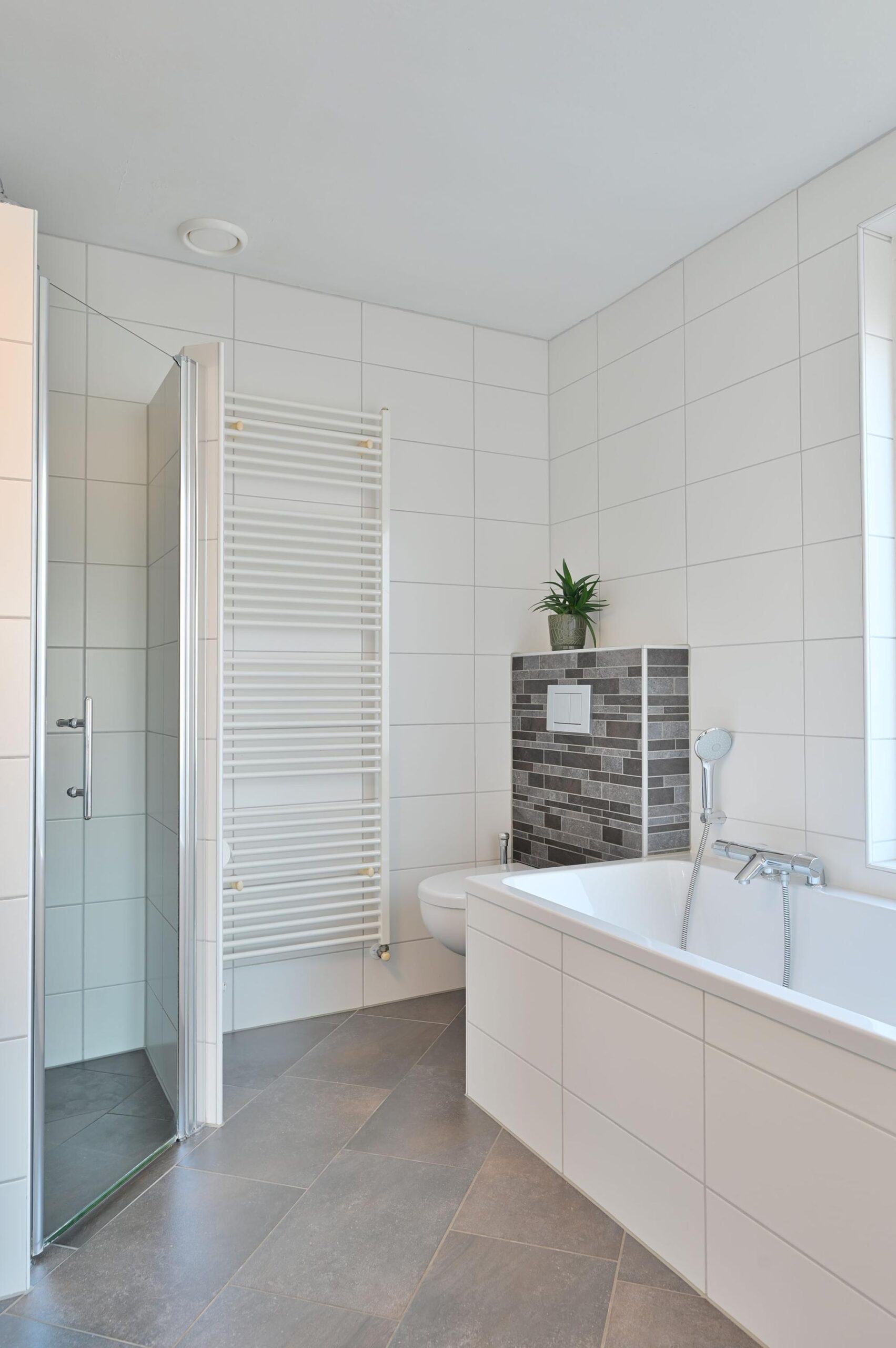 Ook de badkamer is aan de voorzijde gelegen. De keurige, complete badkamer is modern uitgevoerd en voorzien van een ruime inloopdouche, een ligbad met jets, een wastafelmeubel met spiegelkastje, een toilet en een designradiator.