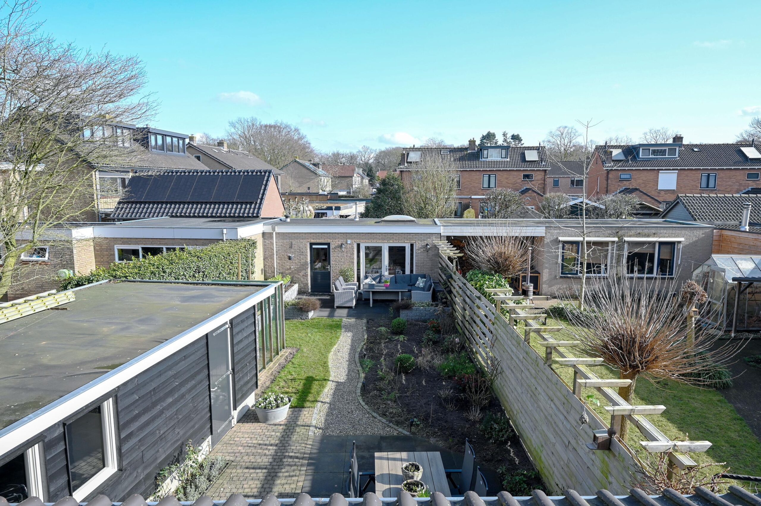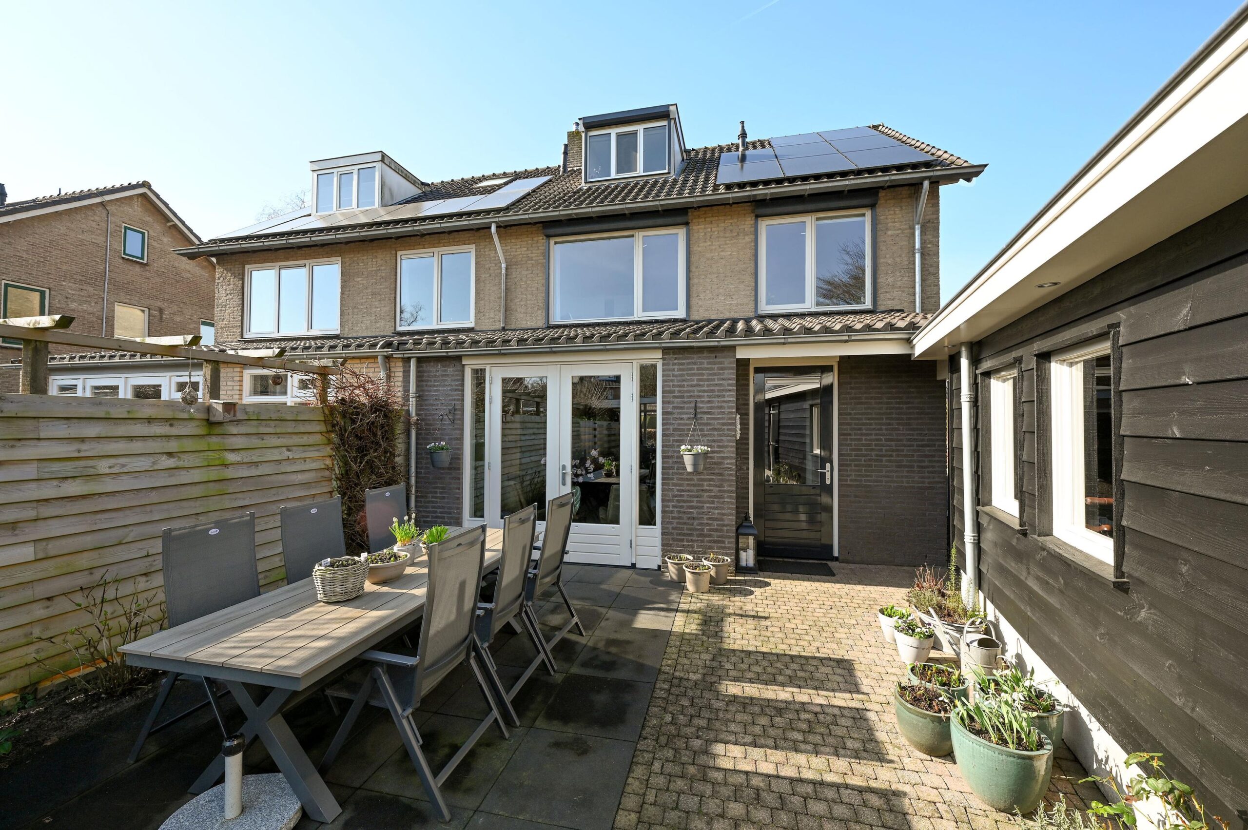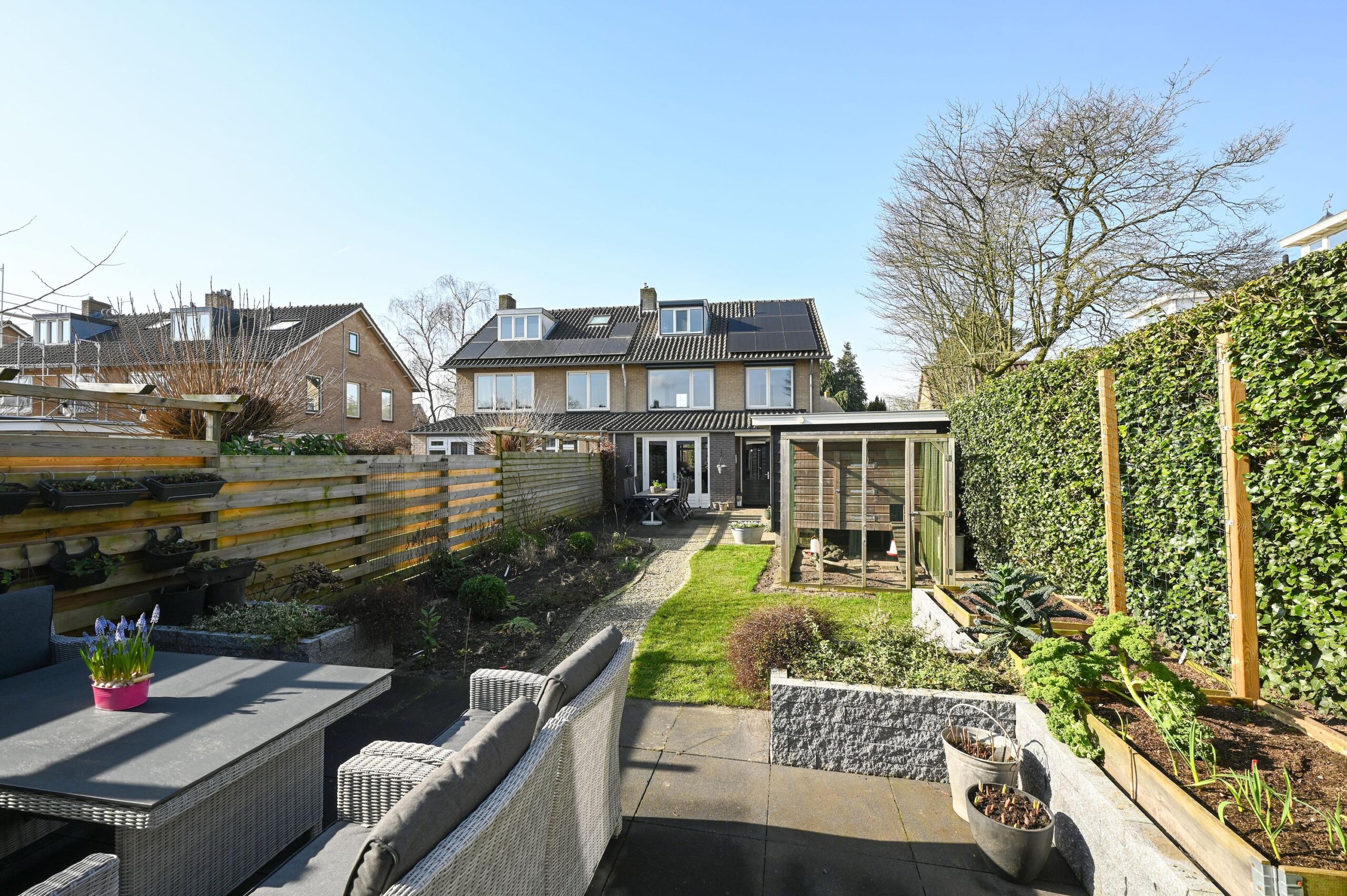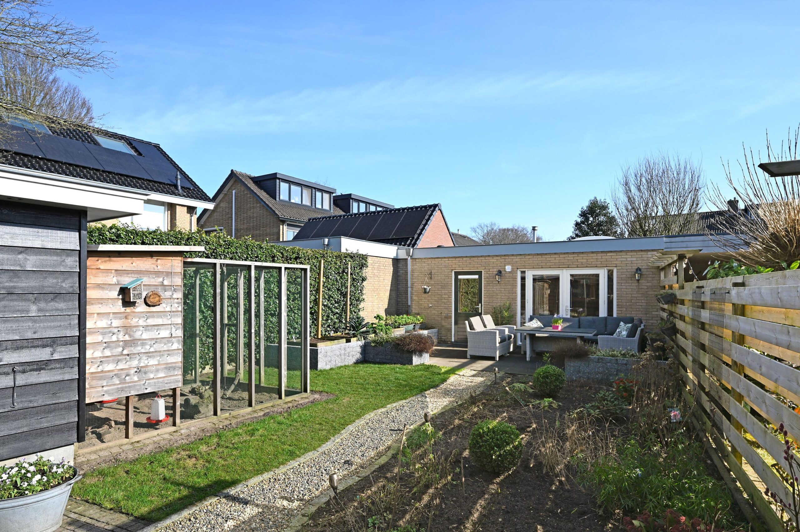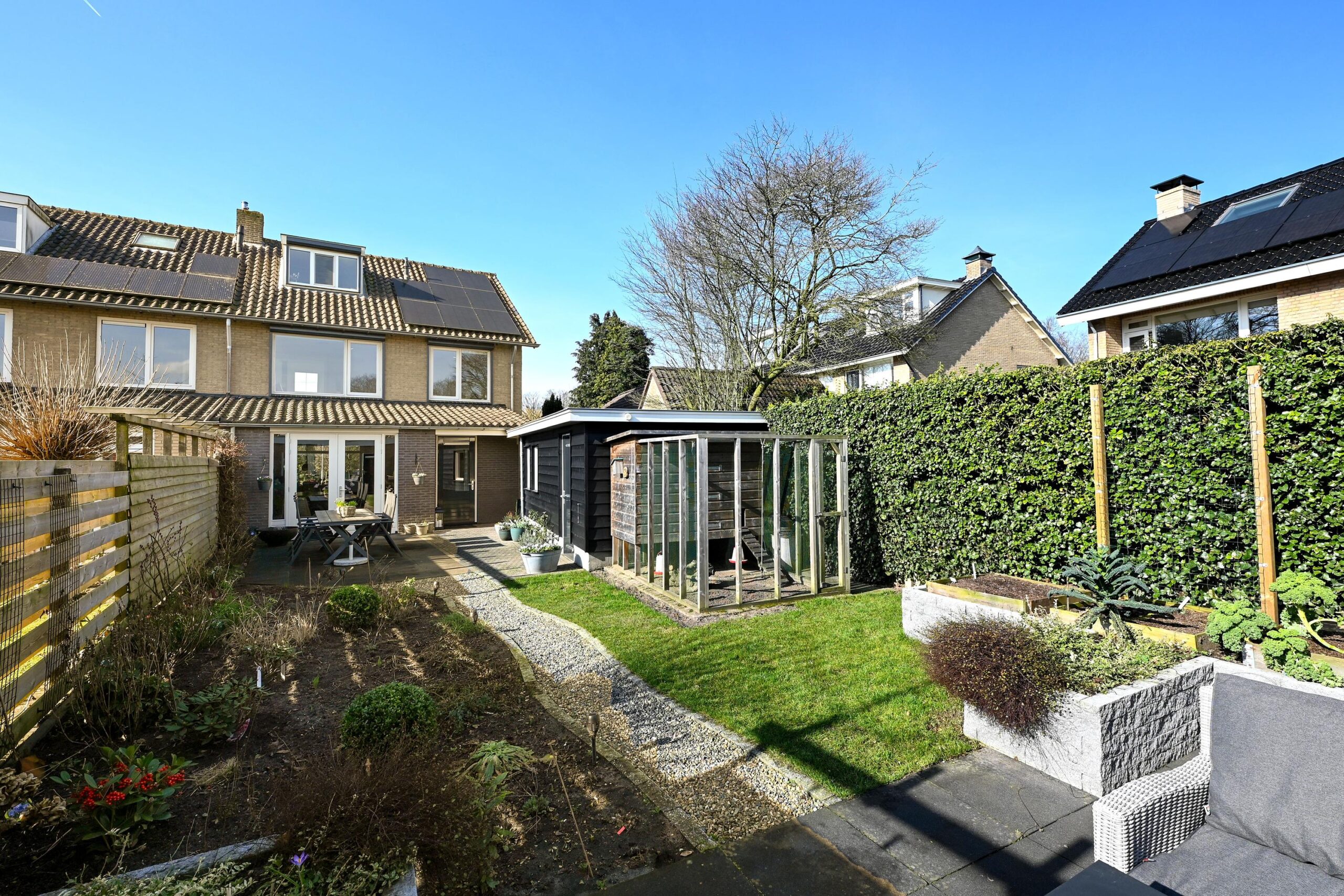 De fraai aangelegde, diepe zonnige achtertuin biedt volop ruimte en privacy. In de tuin staat een multifunctioneel bijgebouw/atelier voorzien van keukenblok, gashaard, openslaande deuren en een lichtkoepel, een fijne plek om te ontspannen of te werken.