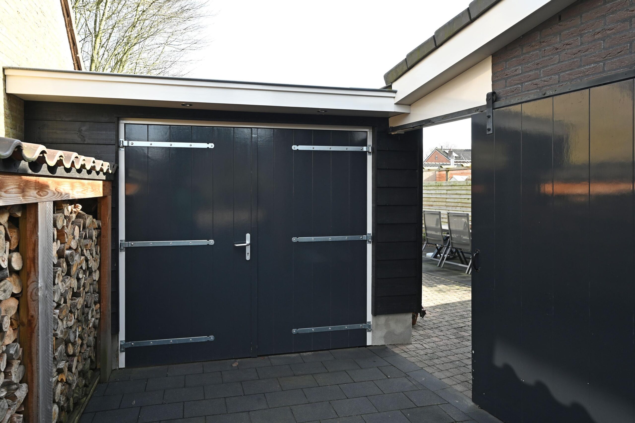 Vanuit de achtertuin is via een loopdeur de charmant gepotdekselde en met een nieuw dak verhoogde garage bereikbaar.