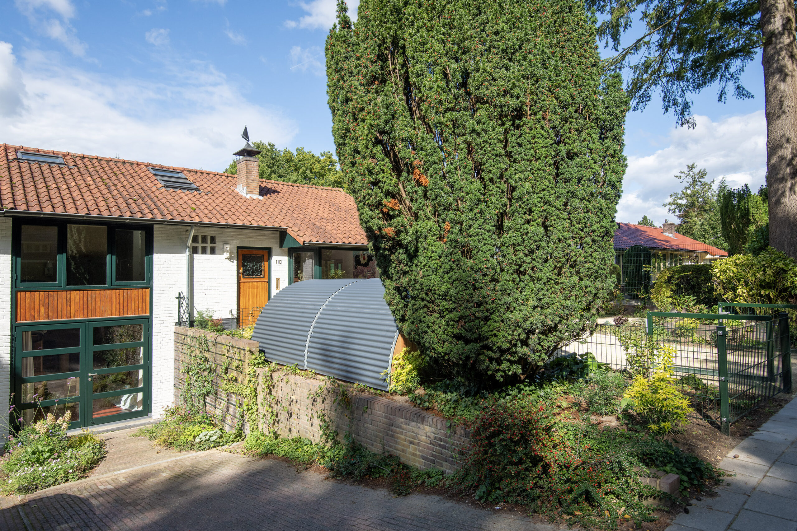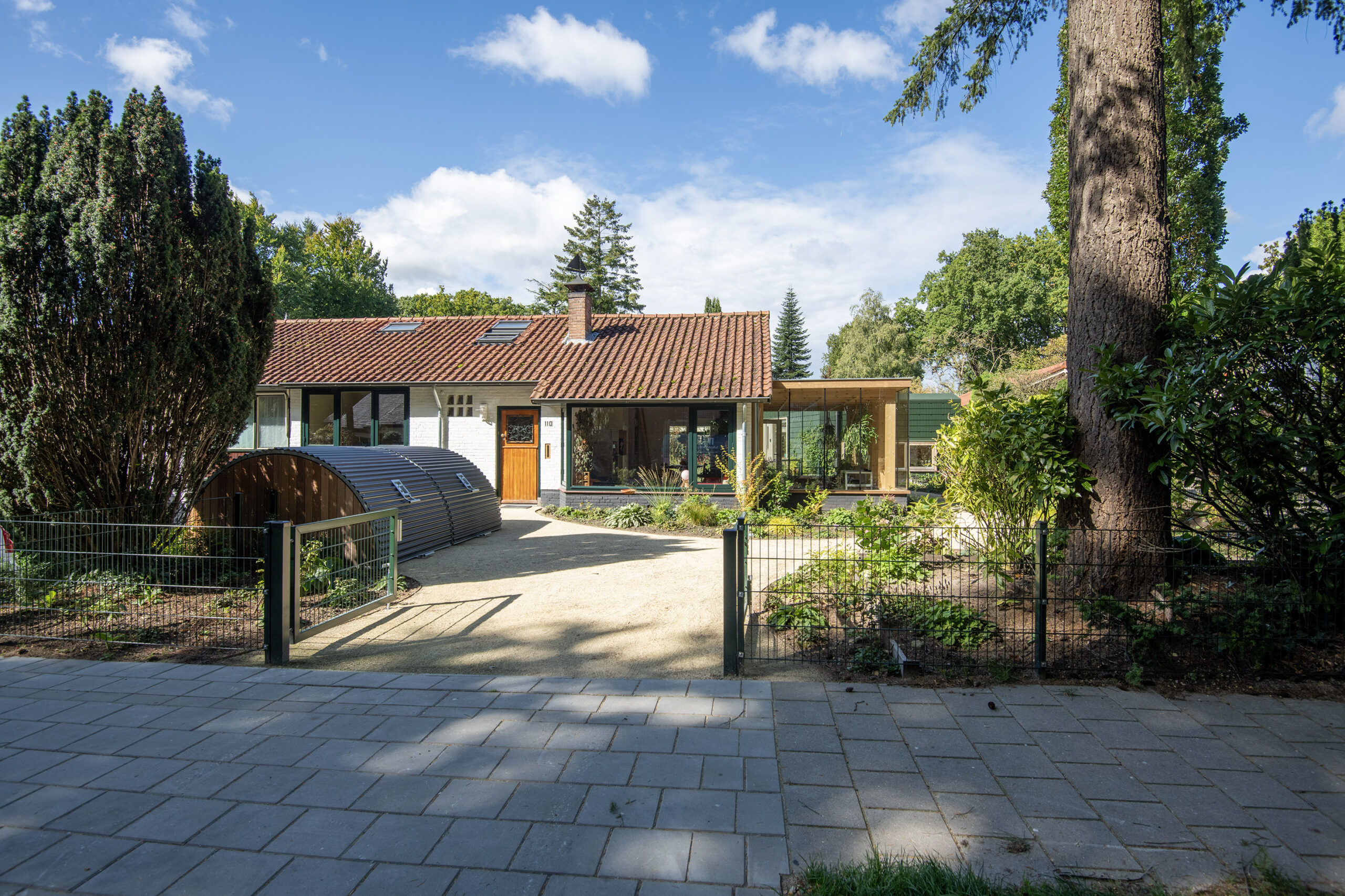 Aan de voorzijde is er ruimte om op eigen terrein te parkeren met daarnaast 2 bijzondere fietsentrommels.