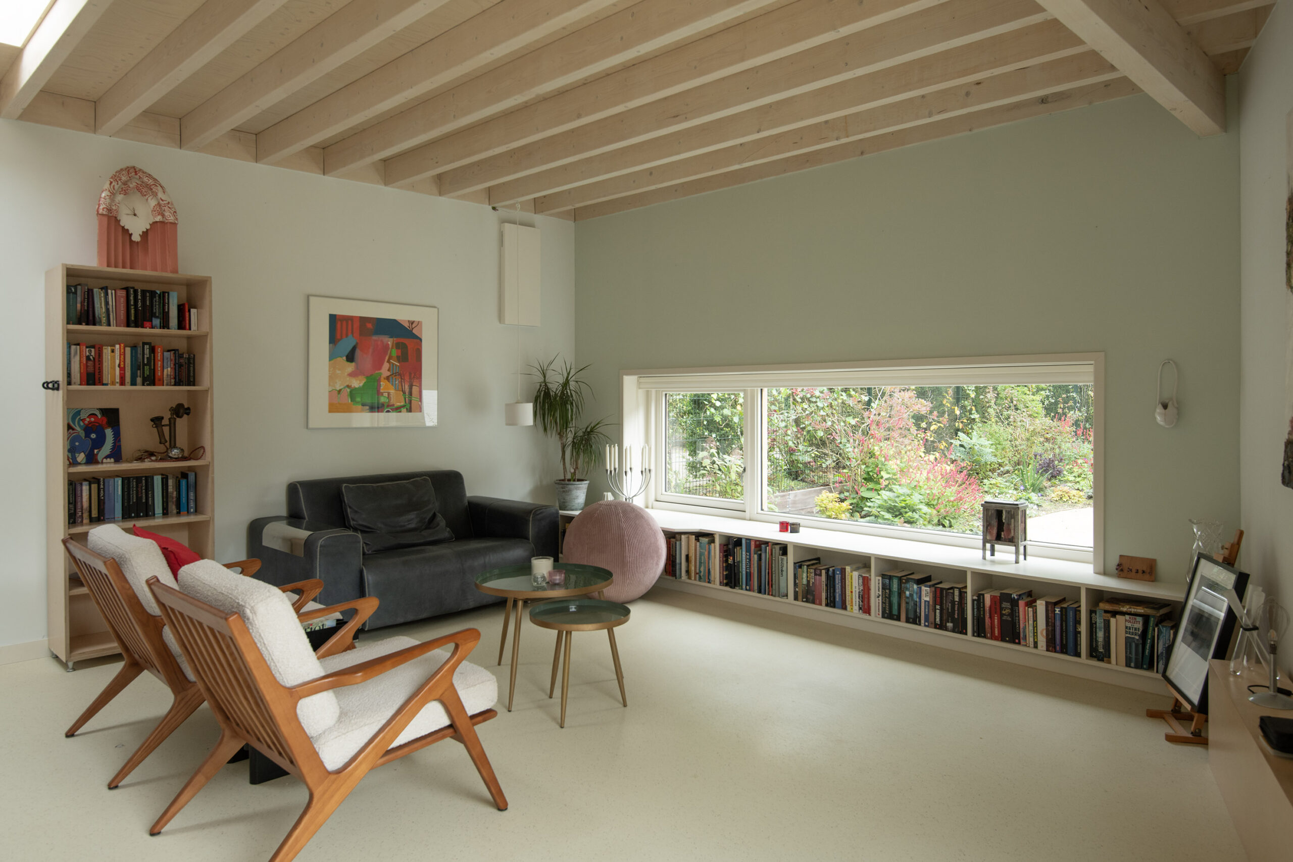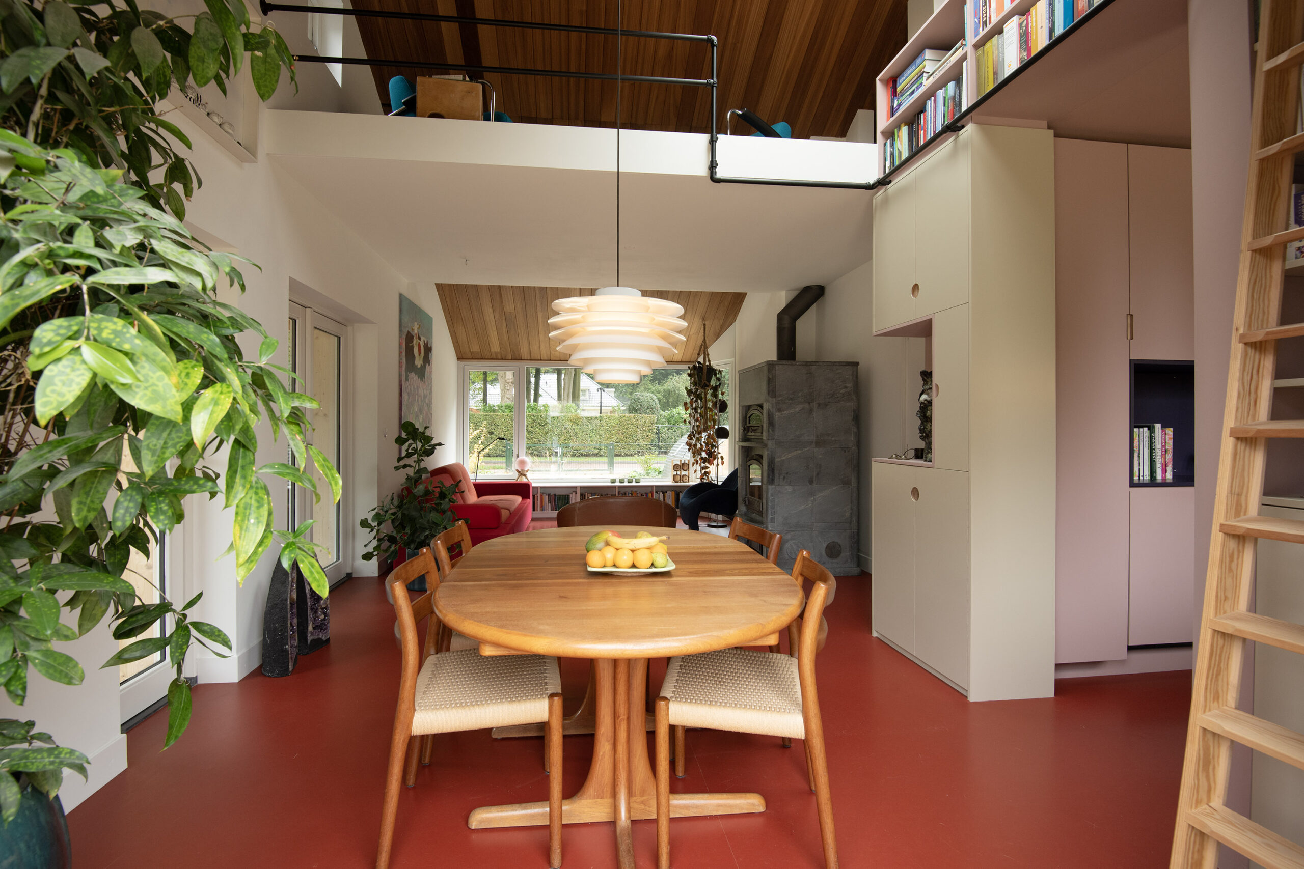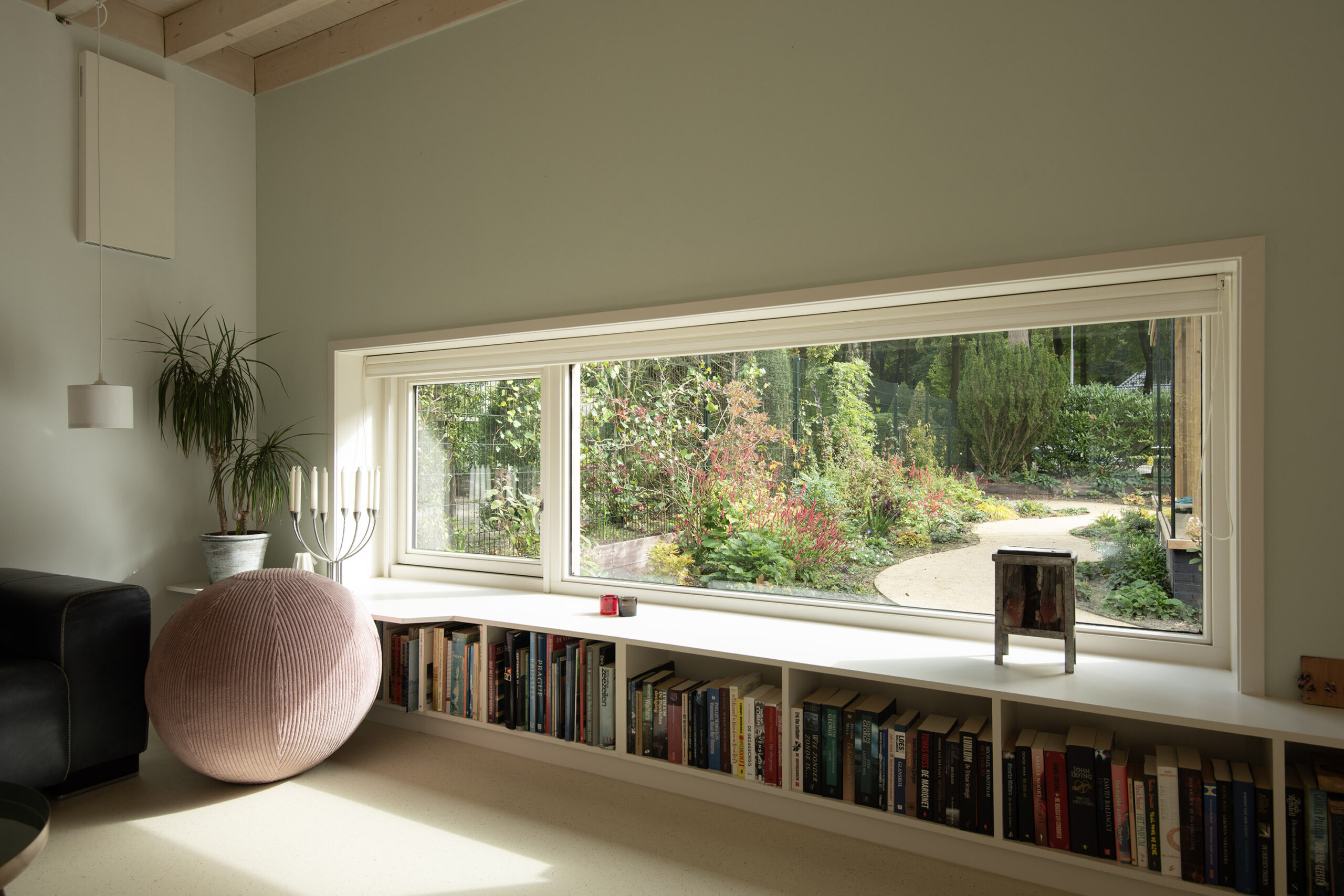 Dankzij de ramen rondom stroomt het daglicht overvloedig naar binnen en wordt het buitenleven binnengehaald.