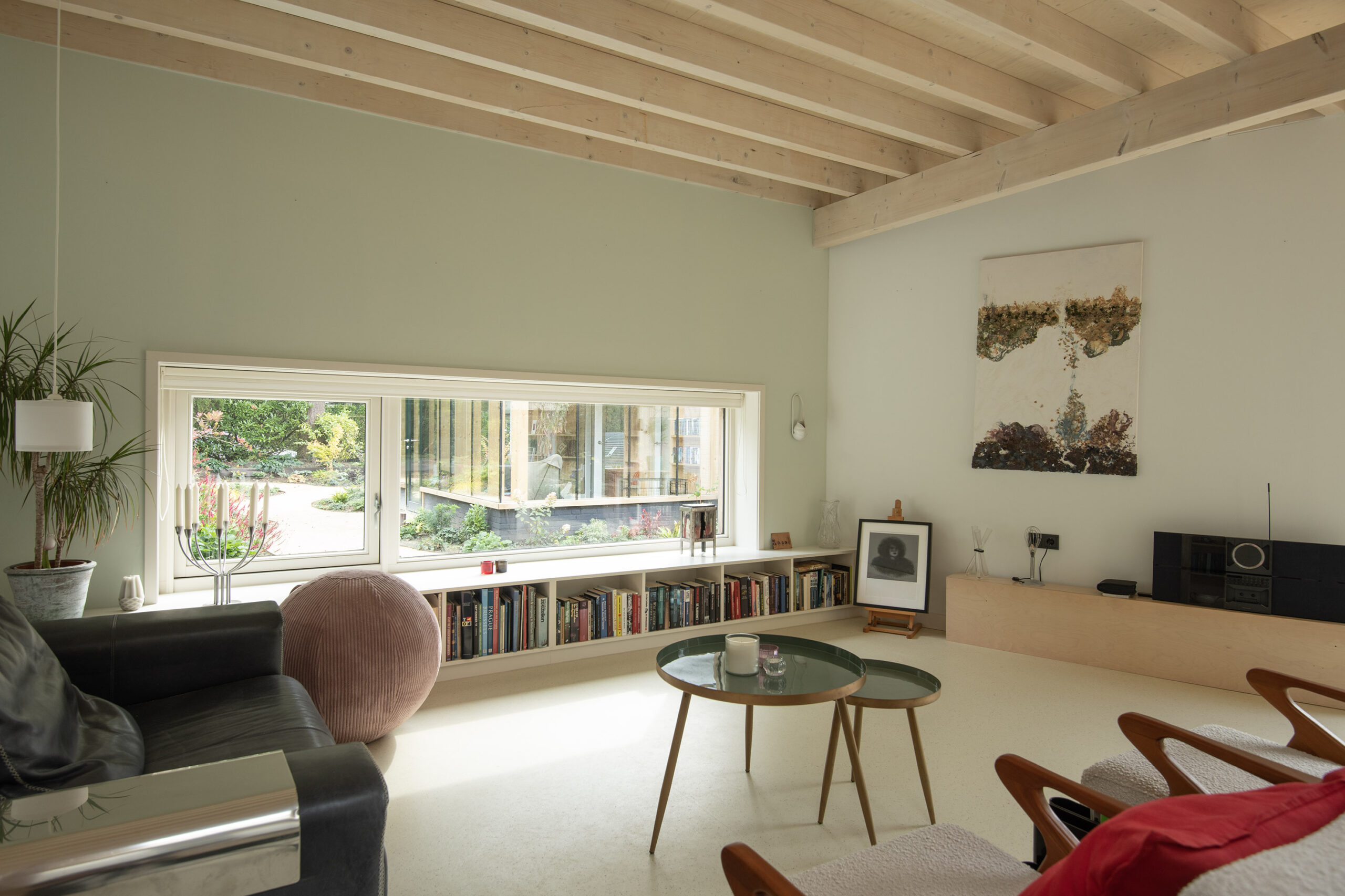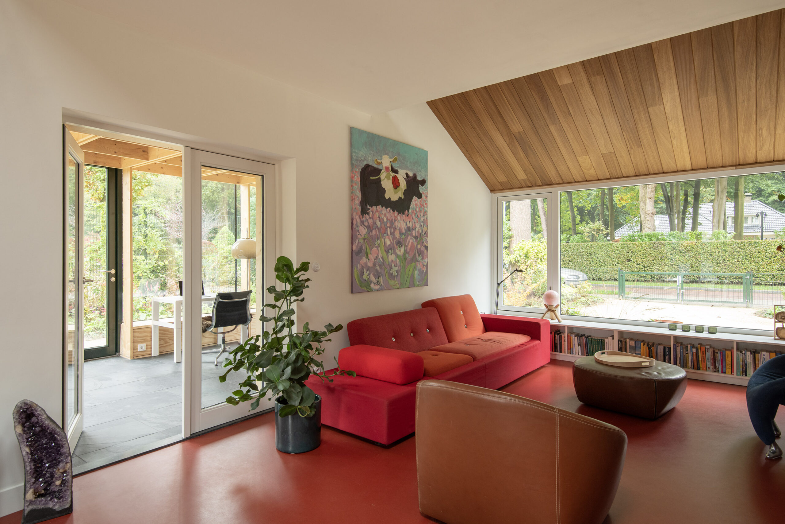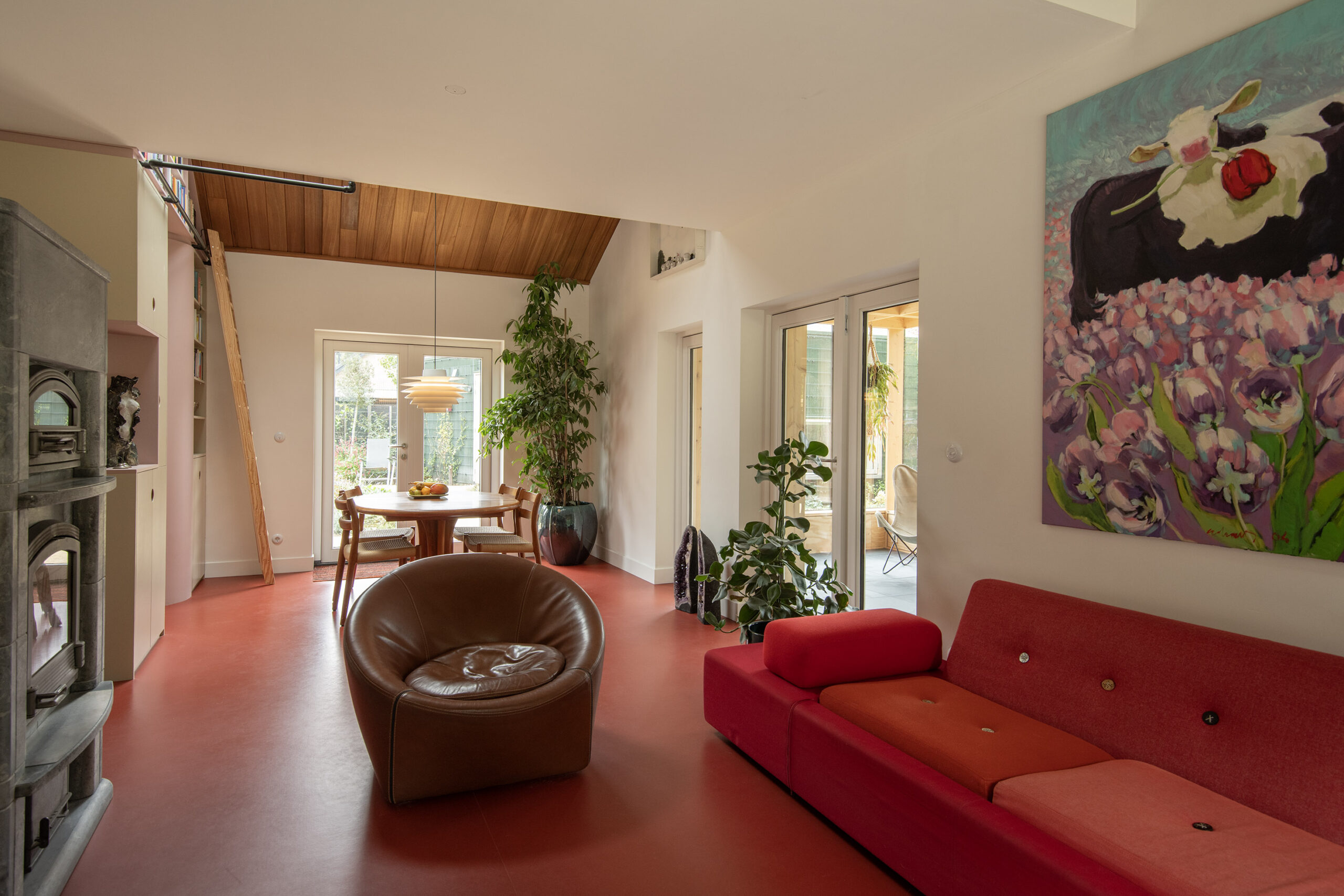 Dankzij de ramen rondom stroomt het daglicht overvloedig naar binnen en wordt het buitenleven binnengehaald.