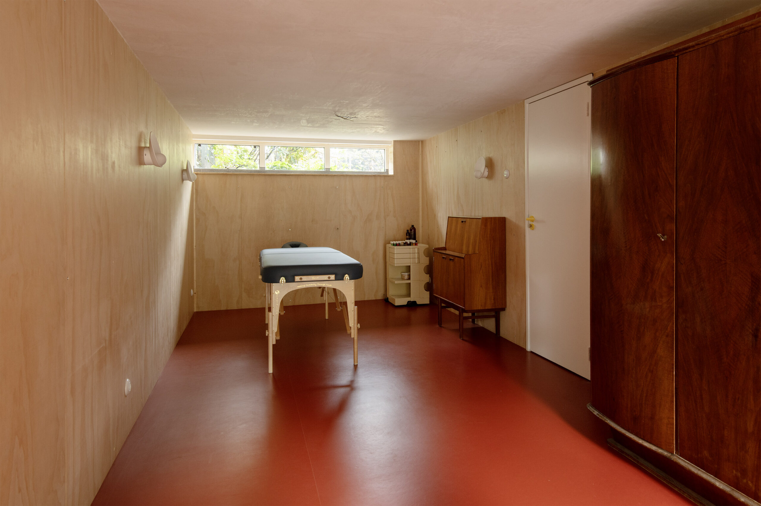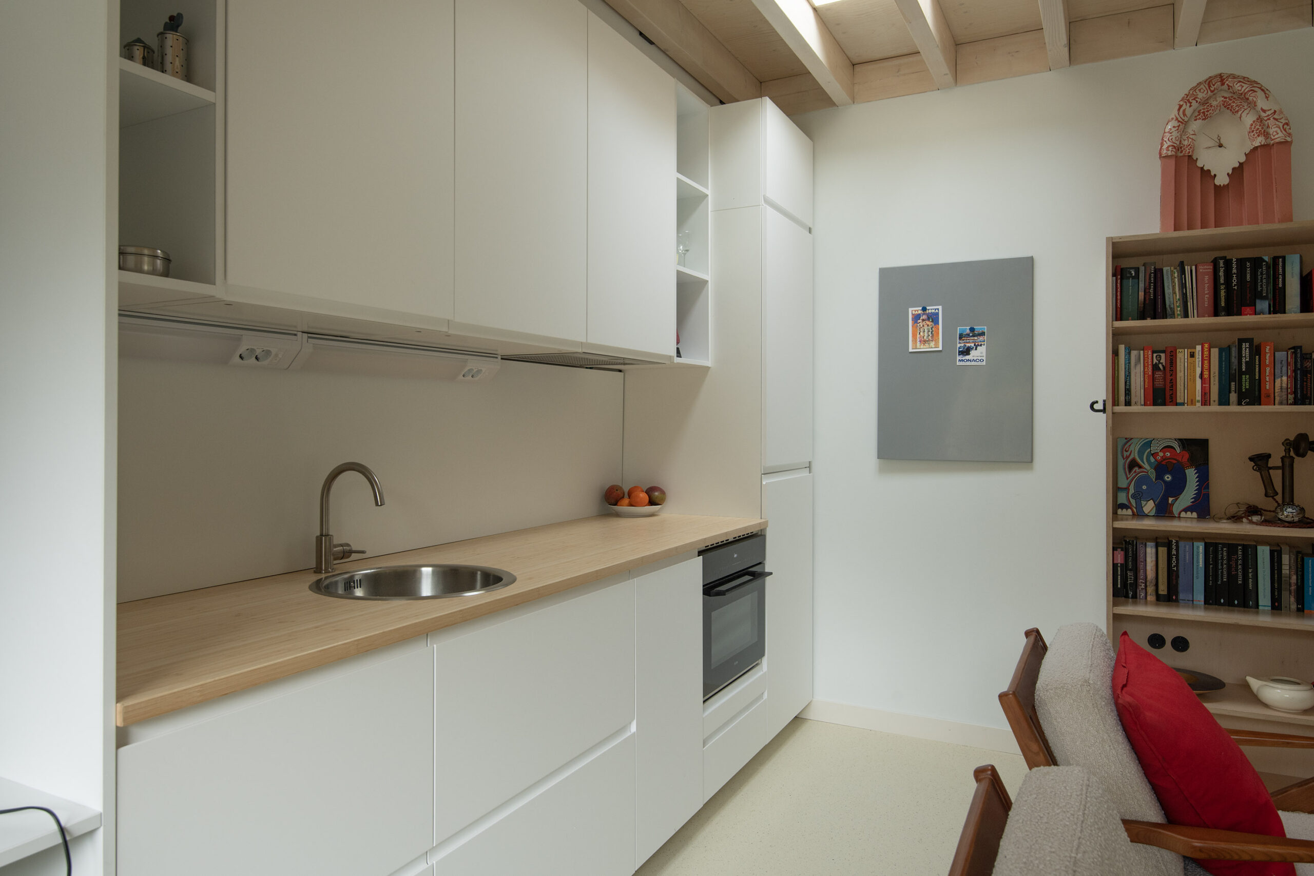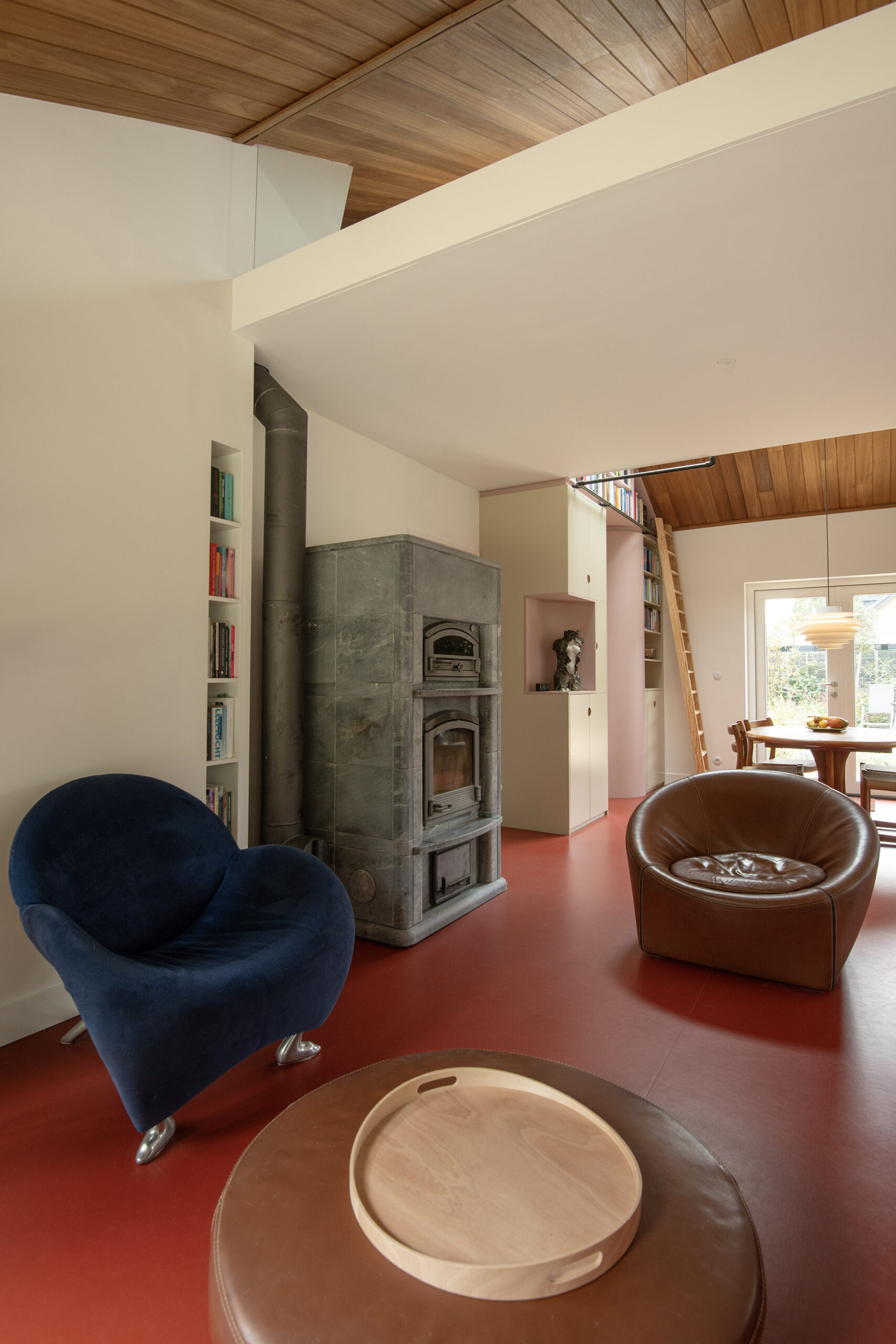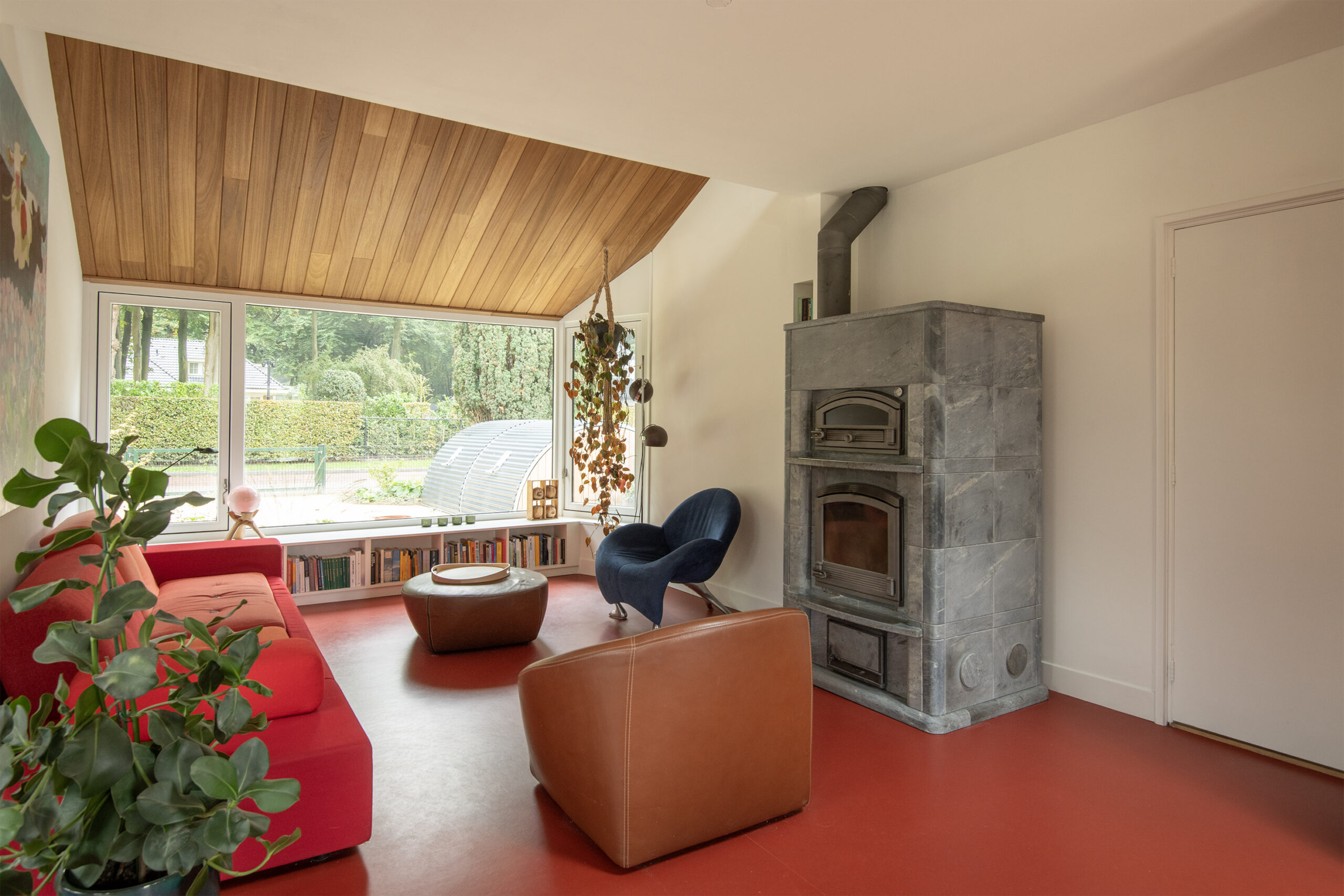 Het houten plafond in vakverdeling loopt op subtiele wijze door in de wand en geeft de ruimte een unieke uitstraling.