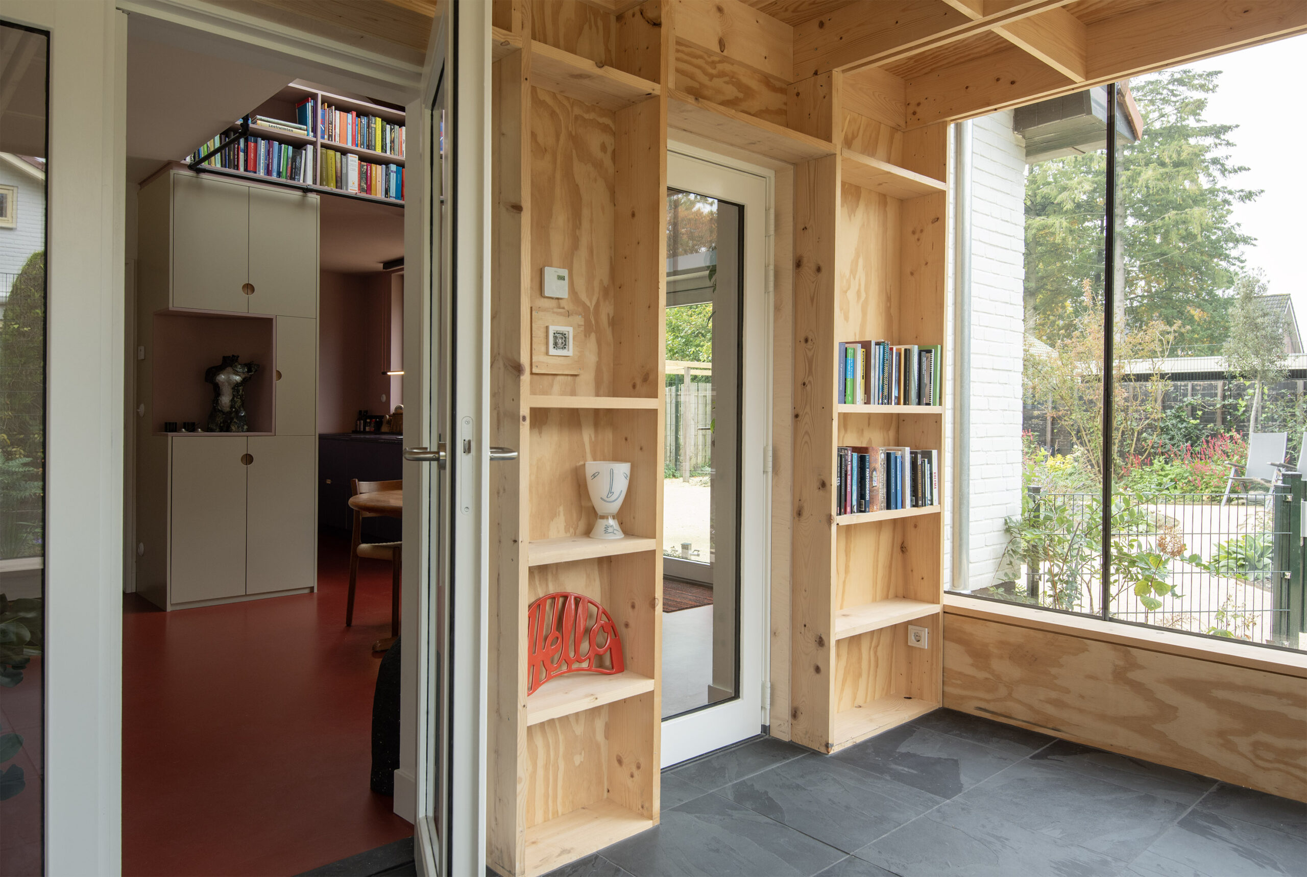 Maar ook de glazen toegangsdeuren naar de serre laten het licht naar binnenstromen.