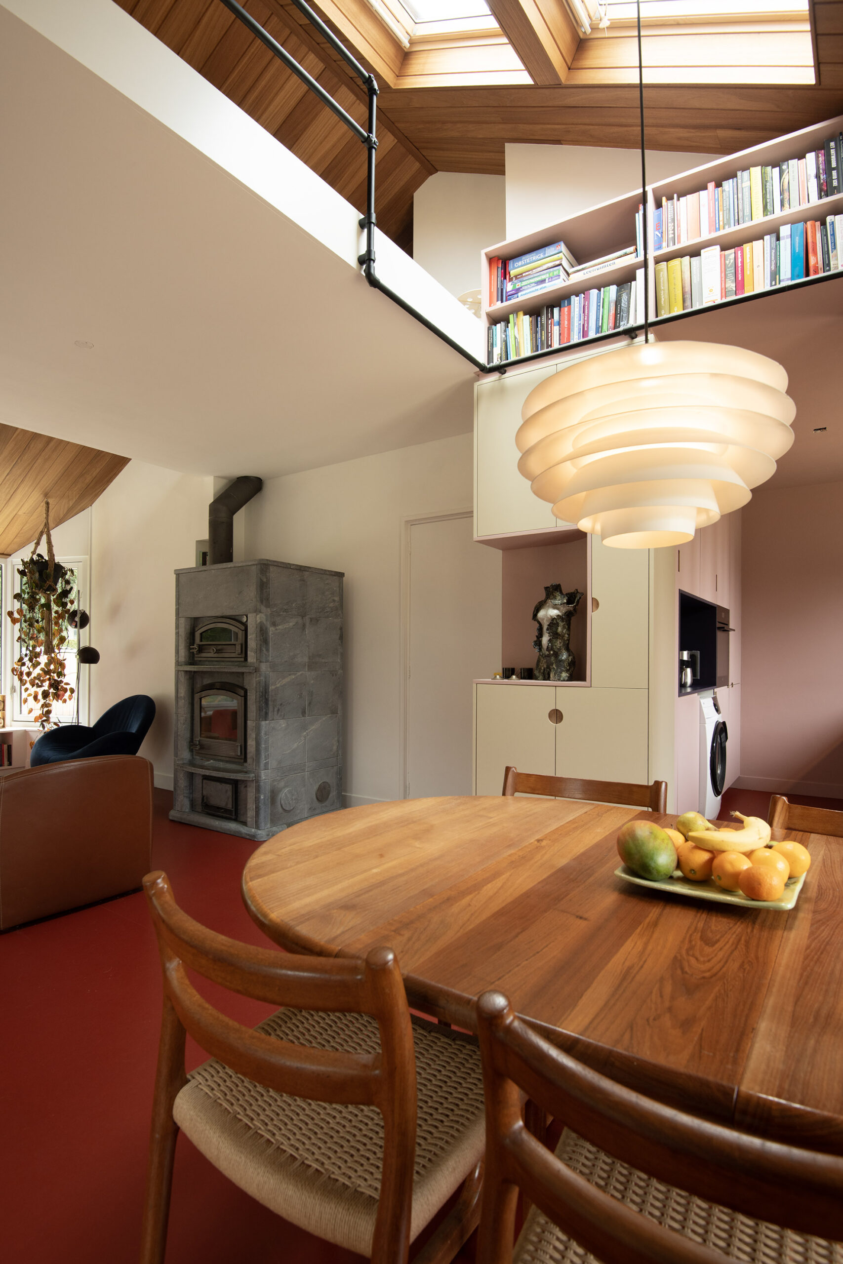 De combinatie van hoogteverschillen, de prachtige lichtinval en het gebruik van natuurlijke materialen en de kleurkeuzes geven de ruimte een unieke, architectonische beleving, open, warm en toch intiem.