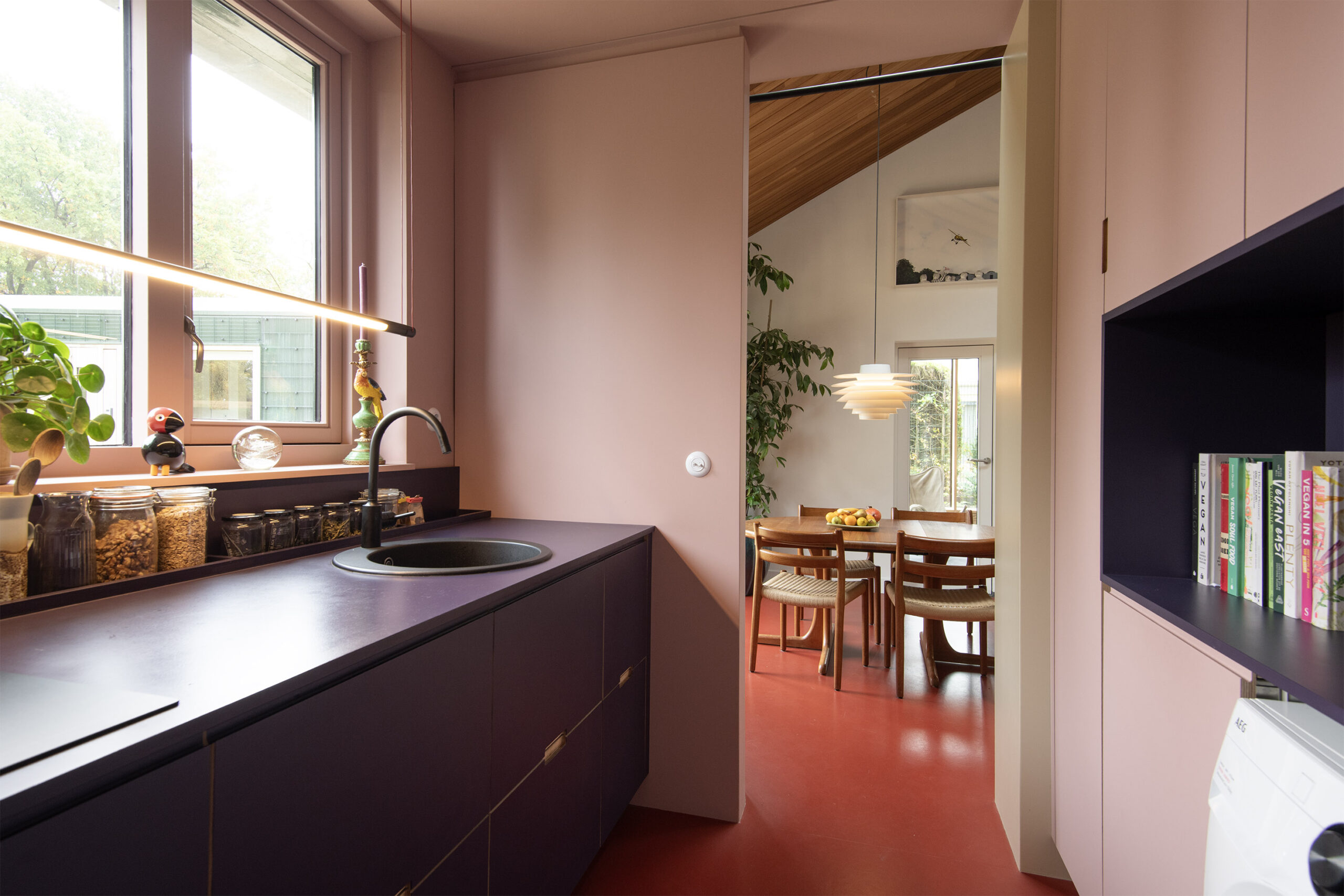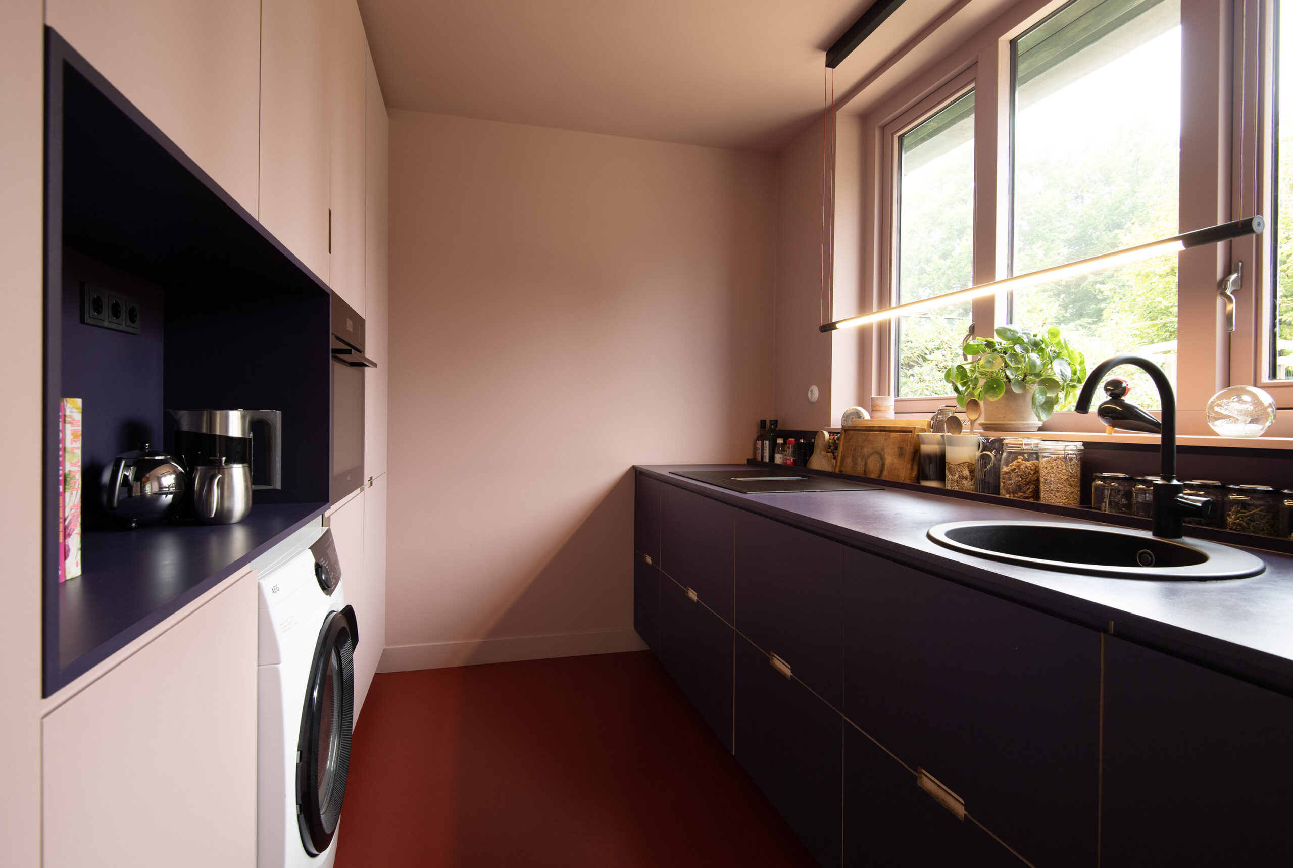 De inductiekookplaat met geïntegreerd afzuigsysteem, de vaatwasser en spoelbak zijn onder het grote raam geplaatst.