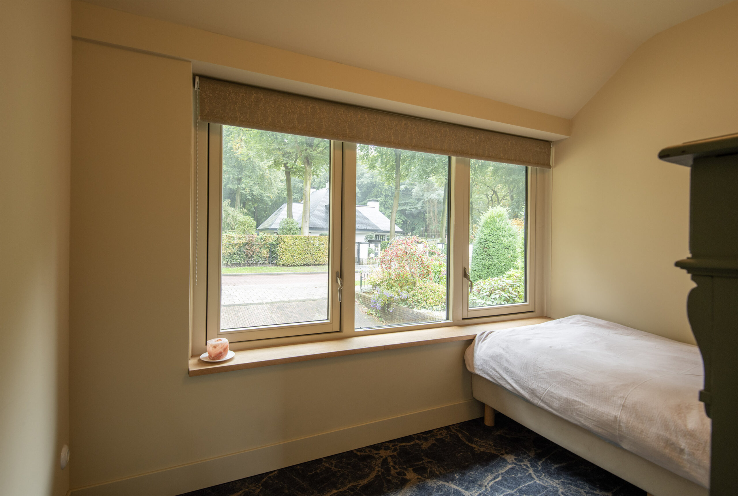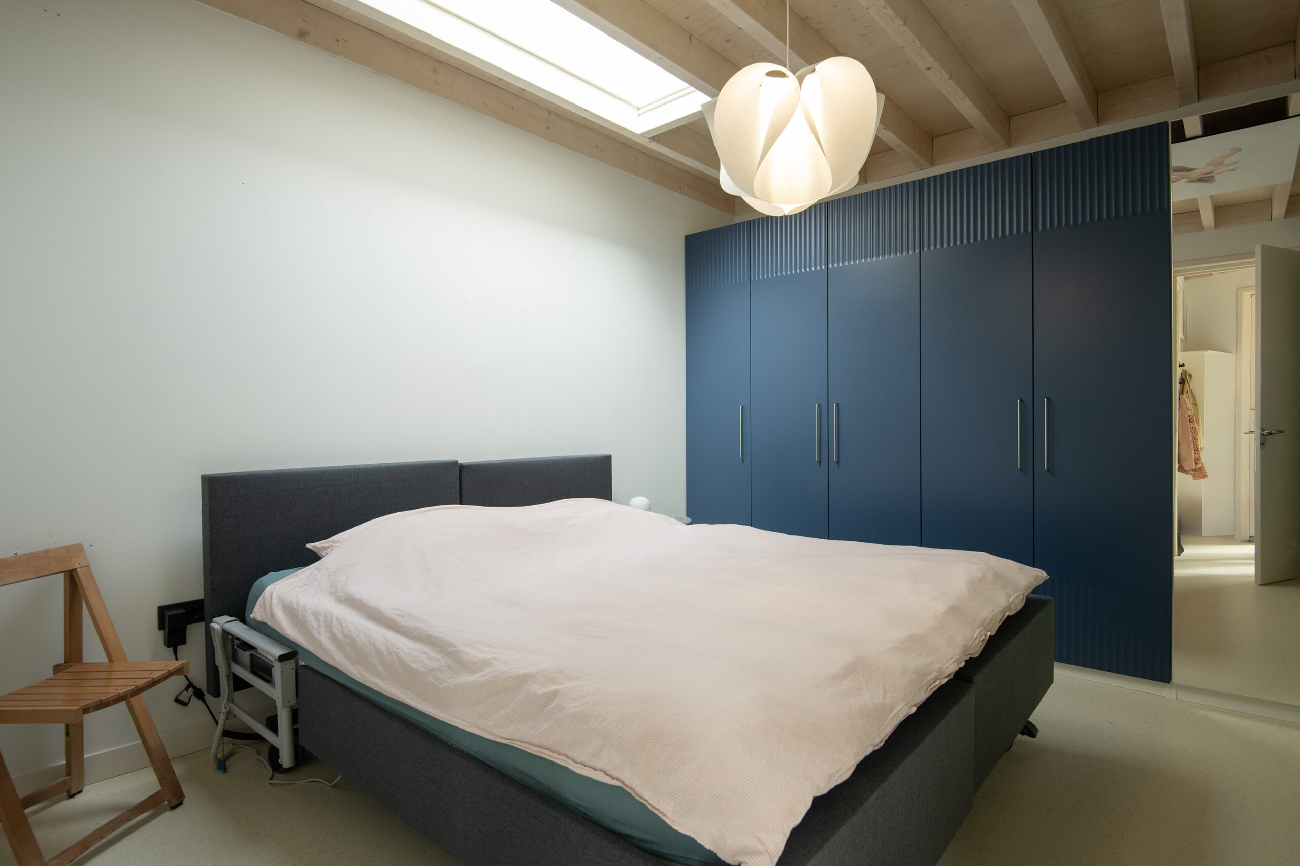 De slaapkamer beschikt over een fraaie lichtstraat, een praktische vaste kastenwand en elektrisch bedienbare raambekleding, wat een luxe!