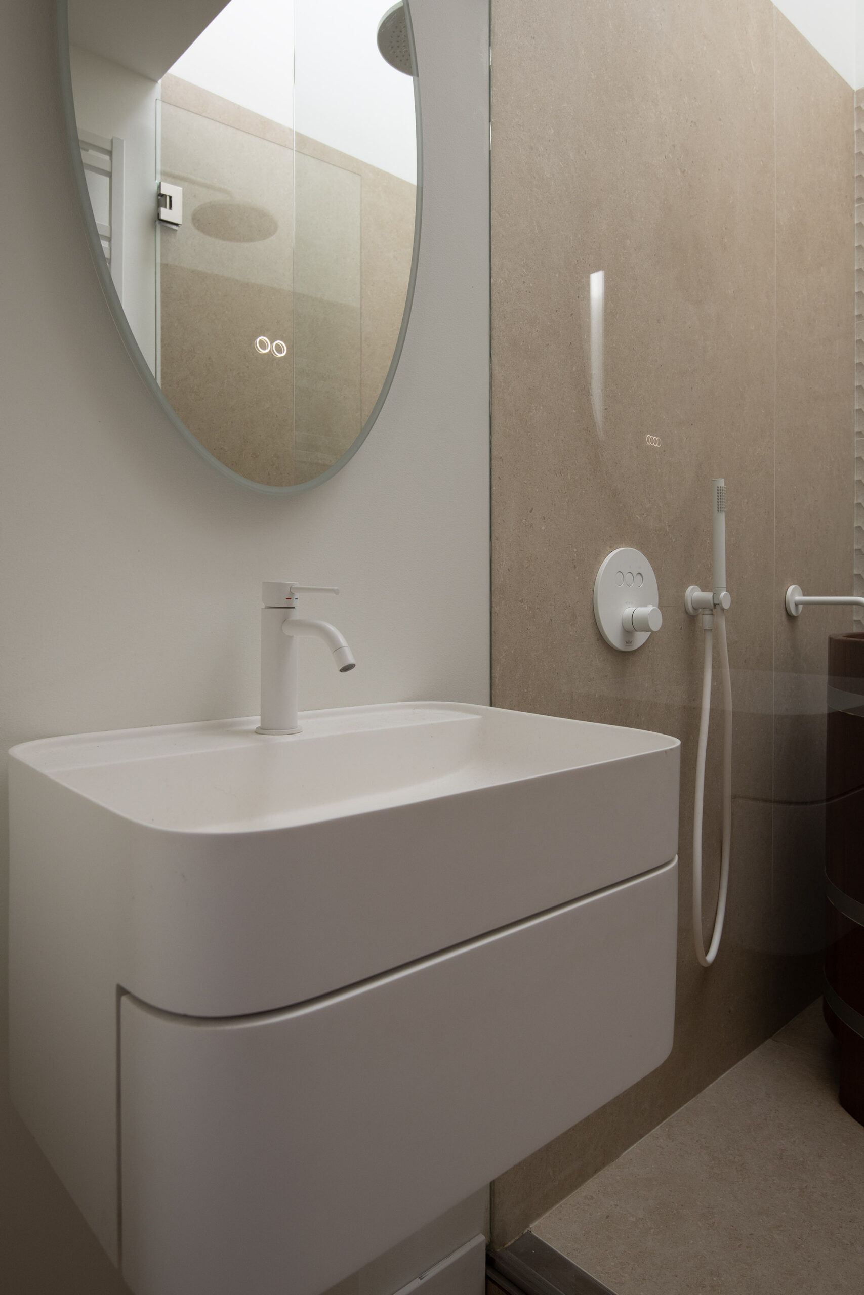 Dankzij de lichte kleurstelling en vloerverwarming straalt deze ruimte rust en luxe uit.