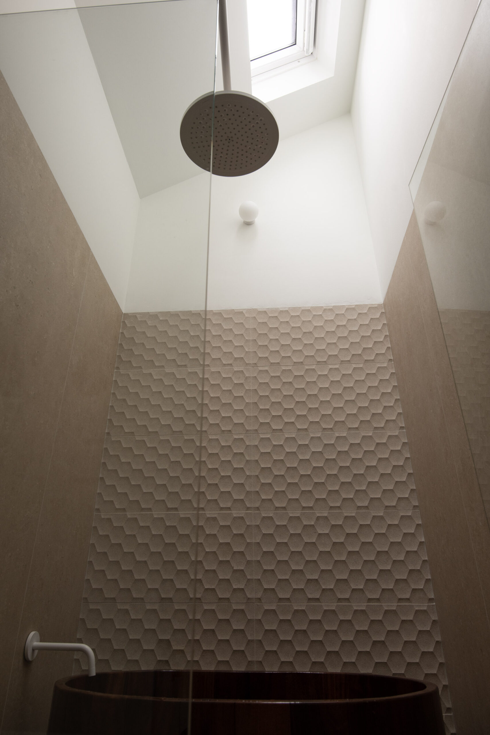 Dankzij de fraaie hoogte en het natuurlijke daglicht, ademt de stijlvolle badkamer rust en elegantie.