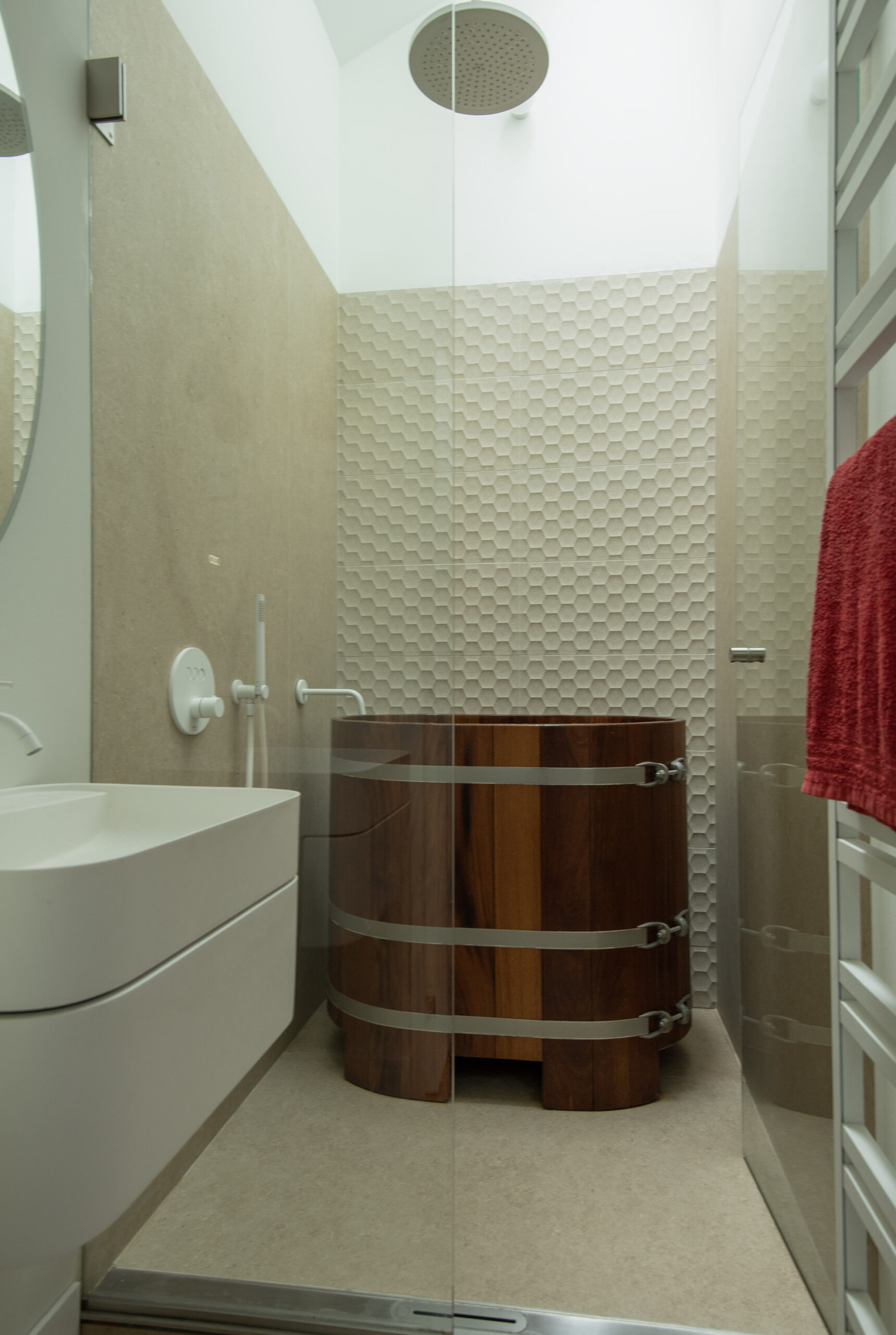 Ingericht met uniek Japans zitbad (Ufuro), douche, glazen douchewand, modern wastafelmeubel, design radiator en met smaakvolle betegeling afgewerkt.