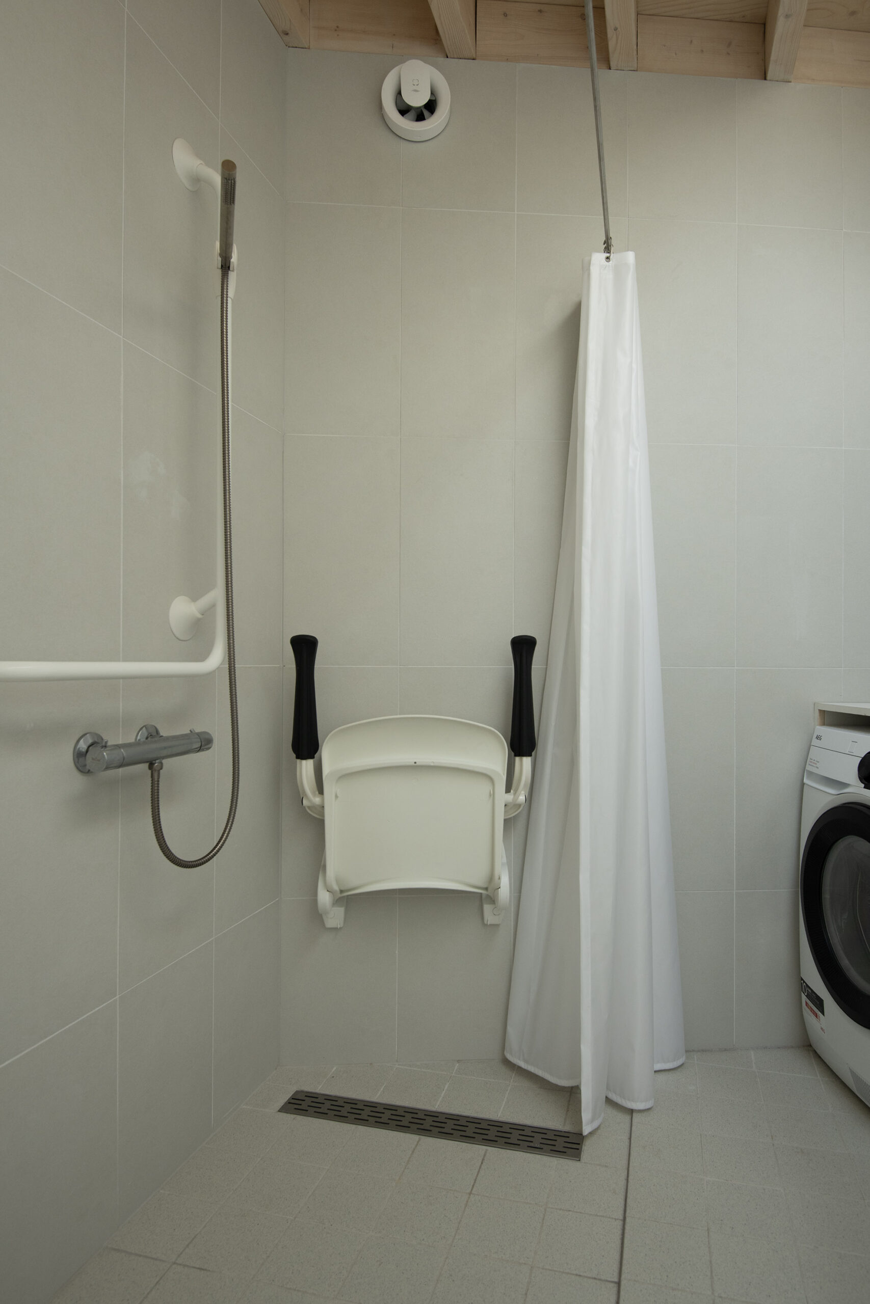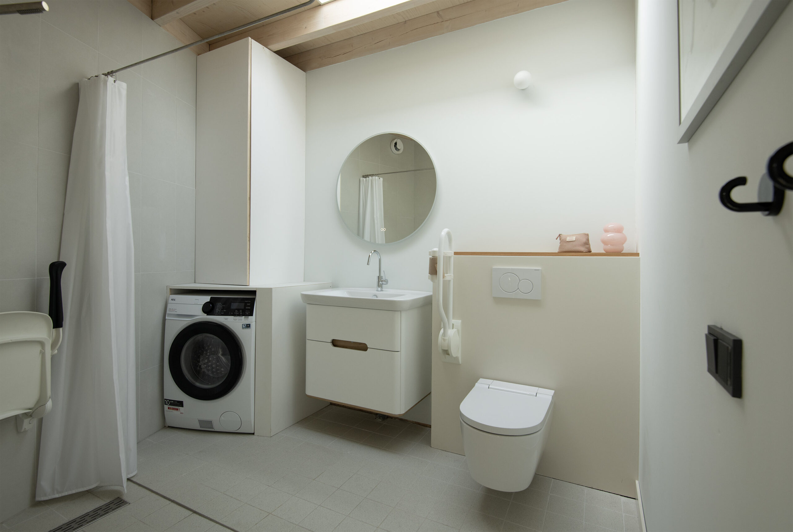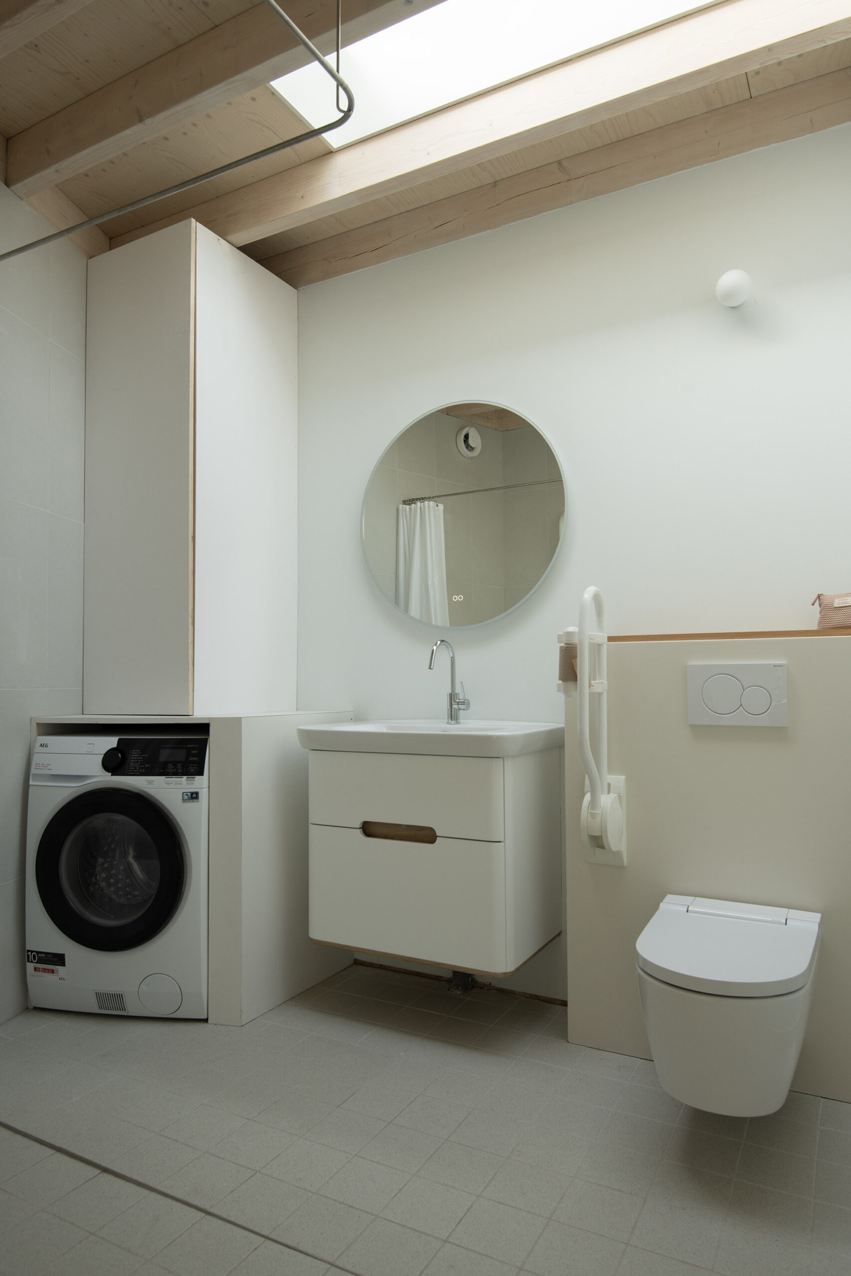 De ruimte is hoogwaardig afgewerkt met een stijlvol wastafelmeubel, Japans spoeltoilet, douchevoorziening en aansluiting voor wasapparatuur.