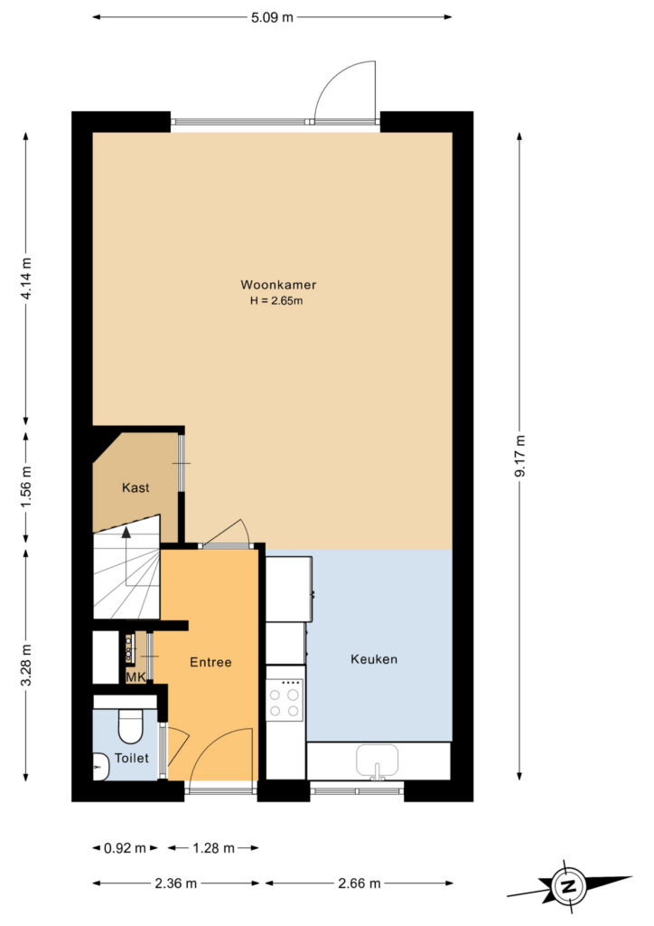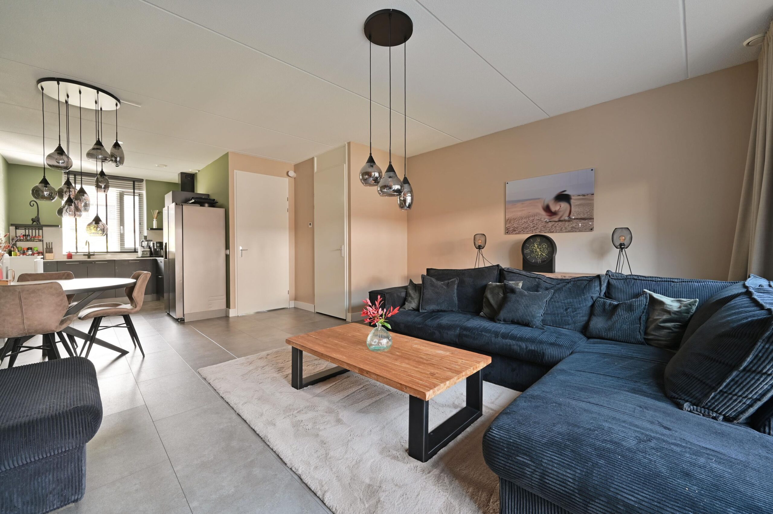 Via de entree/hal met toiletruimte en trapopgang is de sfeervolle woonkamer met open keuken bereikbaar.