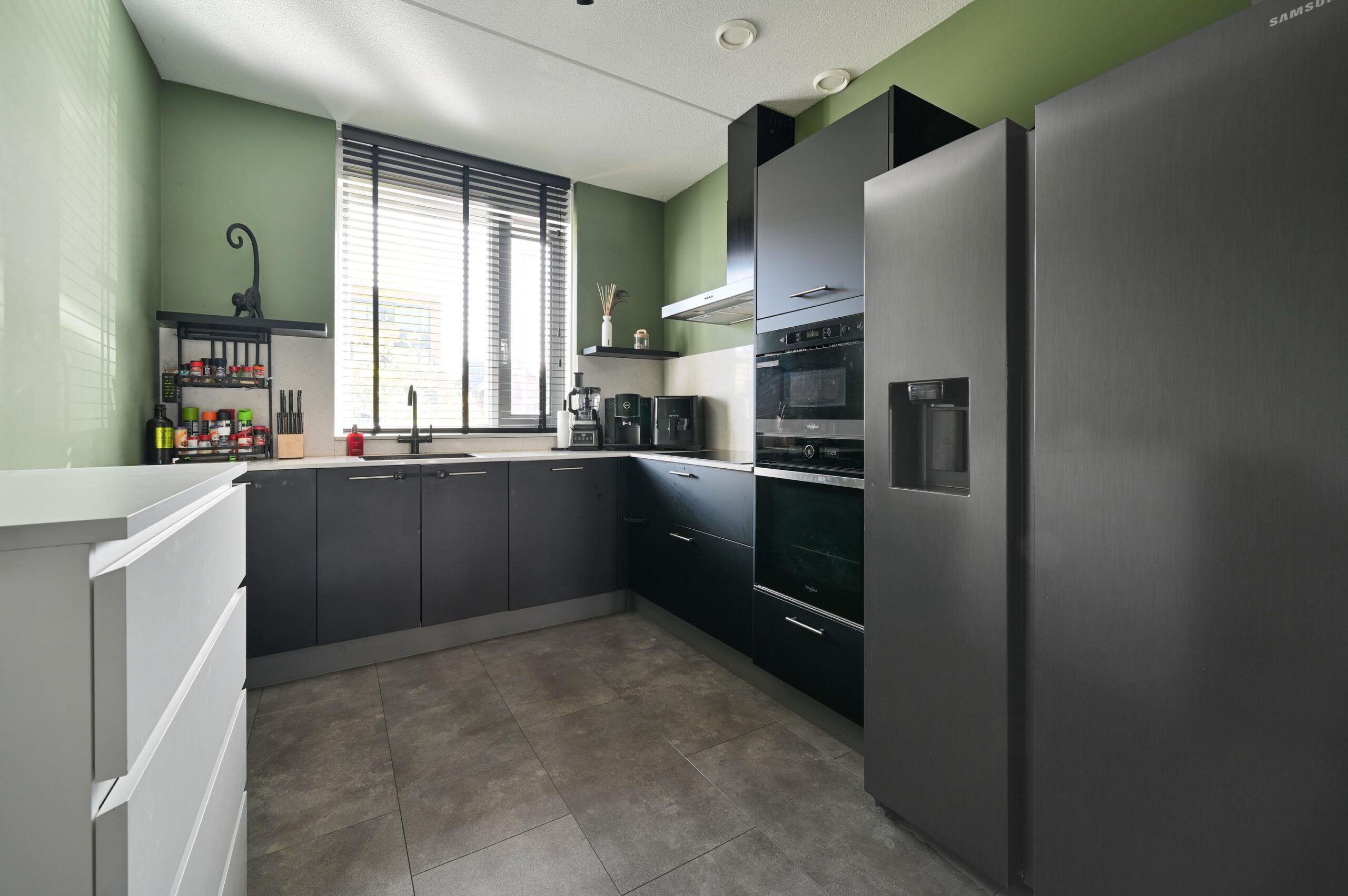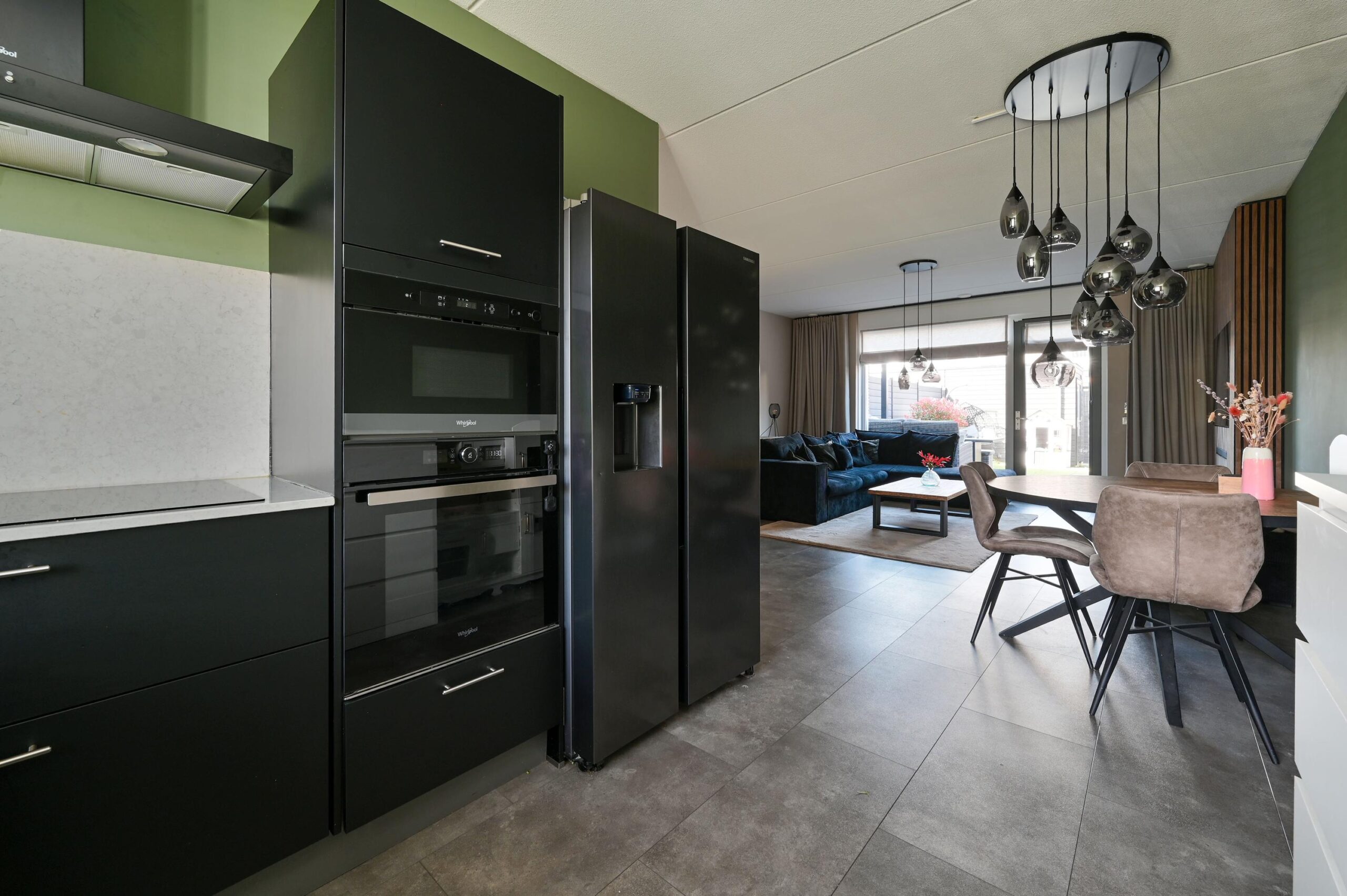 De woonkamer met open keuken heeft een sfeervolle, eigentijdse uitstraling en is afgewerkt met een fraaie pvc-vloer met vloerverwarming. Tevens beschikt de woonkamer over een praktische trapkast. Het zitgedeelte is aan de achterzijde gesitueerd en volledig tuingericht. Het grote raam en de toegangsdeur naar de tuin zorgen hier voor een fijne lichtinval en een prettige verbinding met buiten. De keuken is aan de voorzijde gelegen en kenmerkt zich door een moderne en luxe uitstraling. De keuken is ingericht met diverse gerenommeerde inbouwapparatuur, te weten een inductiekookplaat, afzuigkap, magnetron, oven, koel-/vriescombinatie, vaatwasser en een quooker. Daarnaast biedt de keuken volop bergruimte. De spoelbak is onder het raam geplaatst en het geheel is stijlvol afgewerkt met een aanrechtblad in natuurstenen look.
