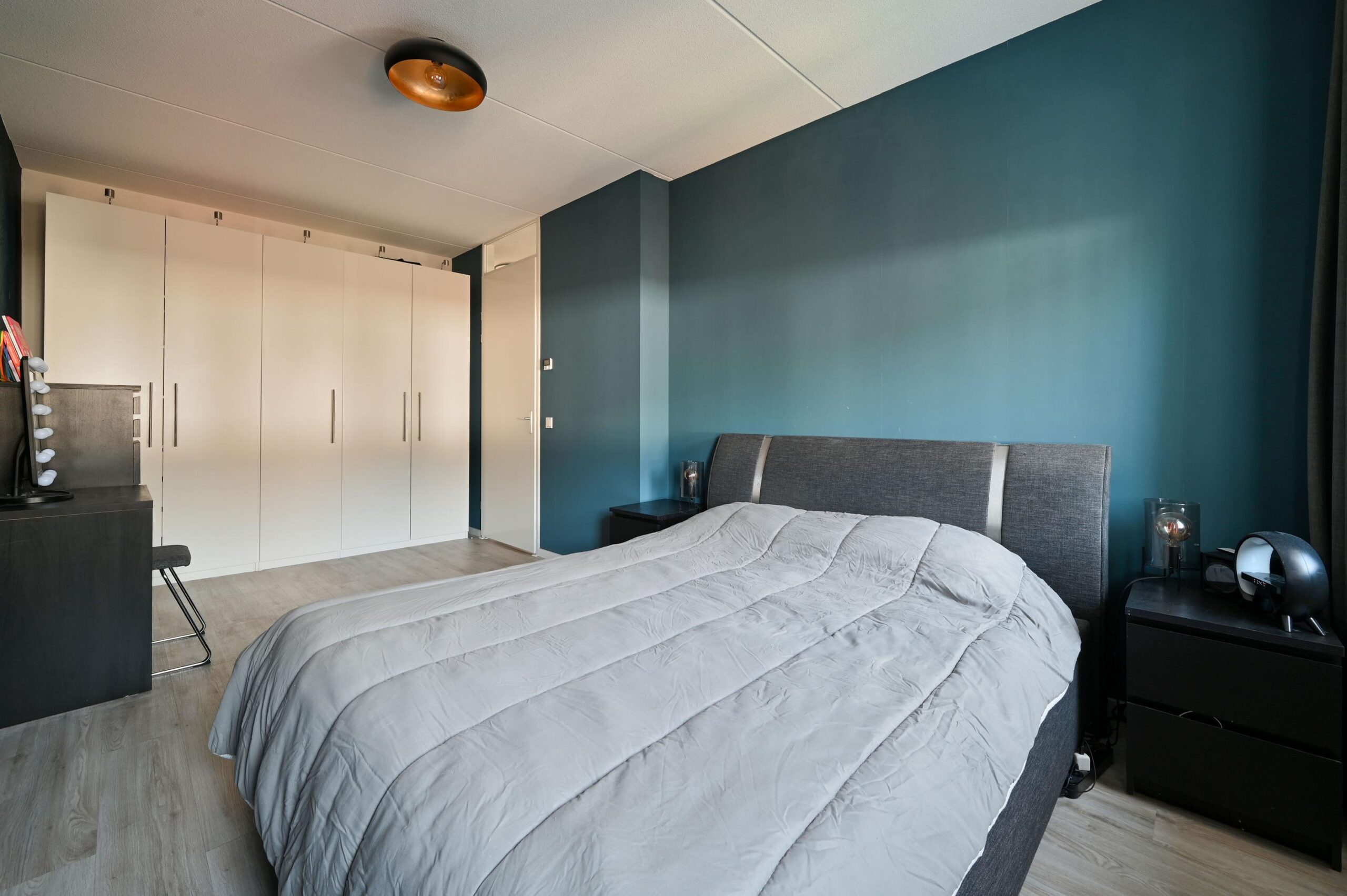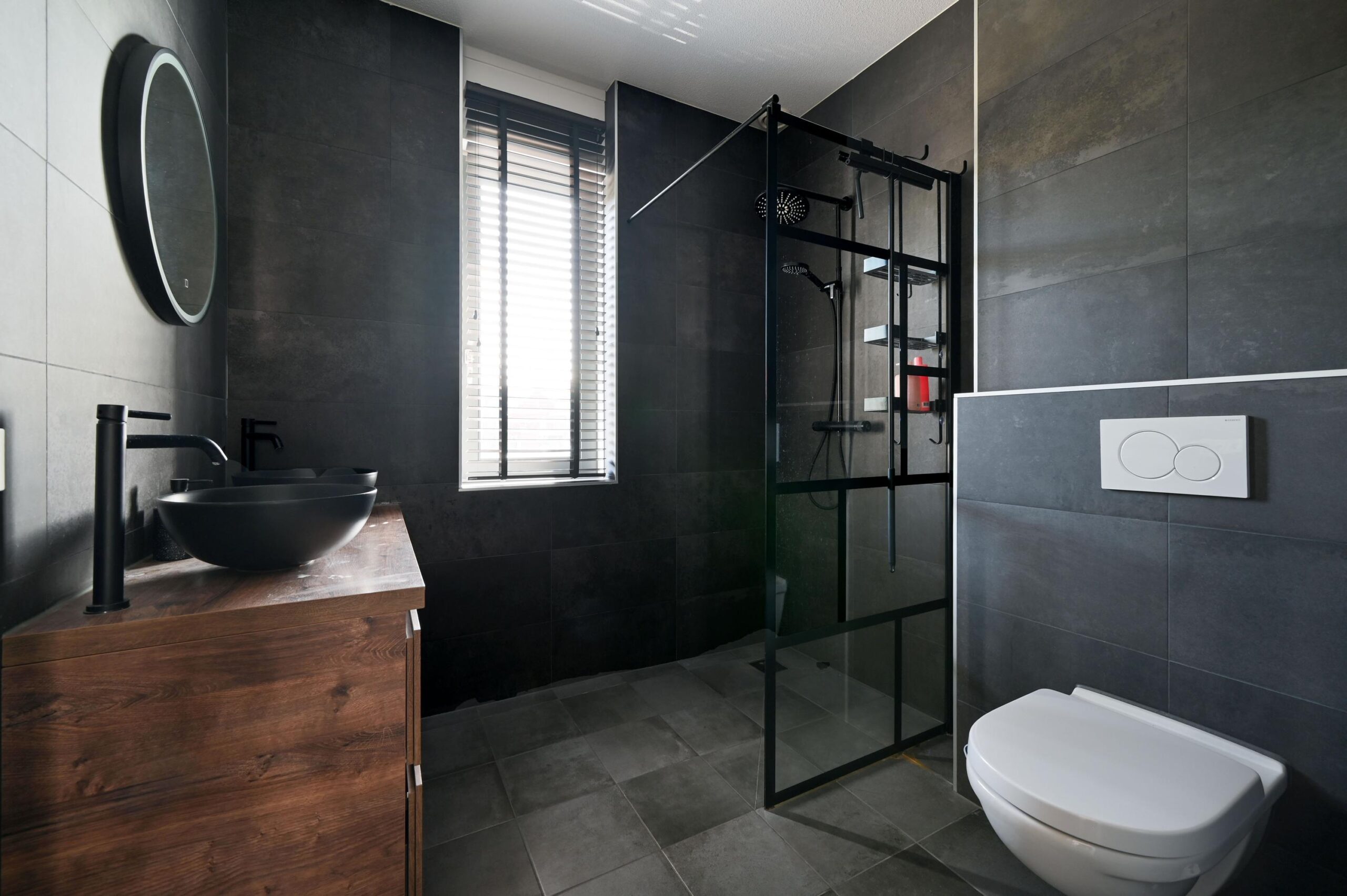 Op de 1e verdieping bevinden zich 3 fijne slaapkamers, elk met een eigen formaat en stijlvolle uitstraling. Alle kamers profiteren van een prettige lichtinval en zijn voorzien van dezelfde PVC-vloer met comfortabele vloerverwarming, wat tegelijkertijd zorgt voor een rust en eenheid. De master bedroom beschikt bovendien over een royale kastenwand. De eigentijdse badkamer heeft een moderne, industriële uitstraling en is stijlvol betegeld tot aan het plafond. De ruimte is ingericht met een inloop-douche voorzien van hoofd- en handdouche en een stalen douchewand. Daarnaast beschikt de badkamer over een houten wastafelmeubel met