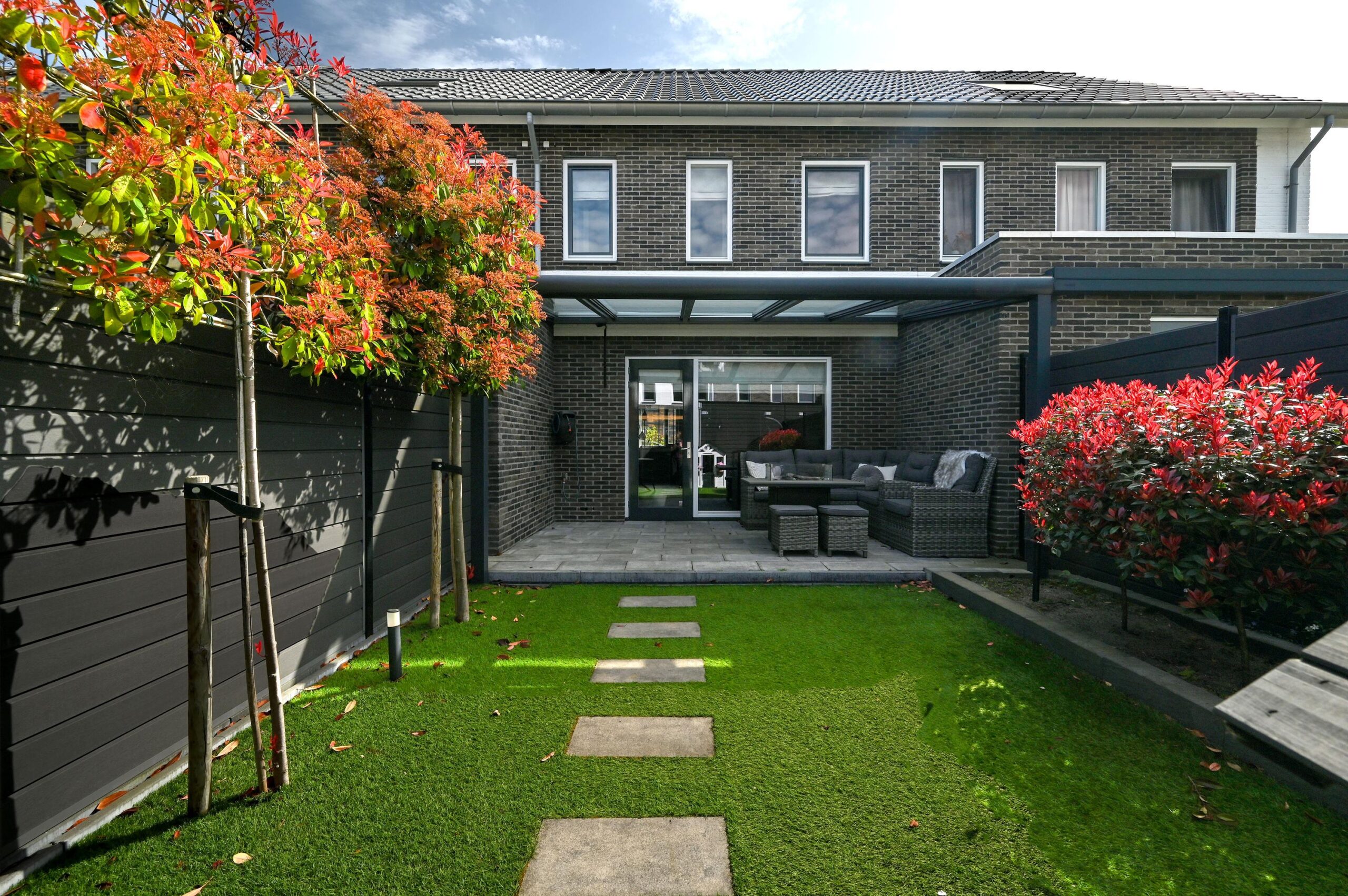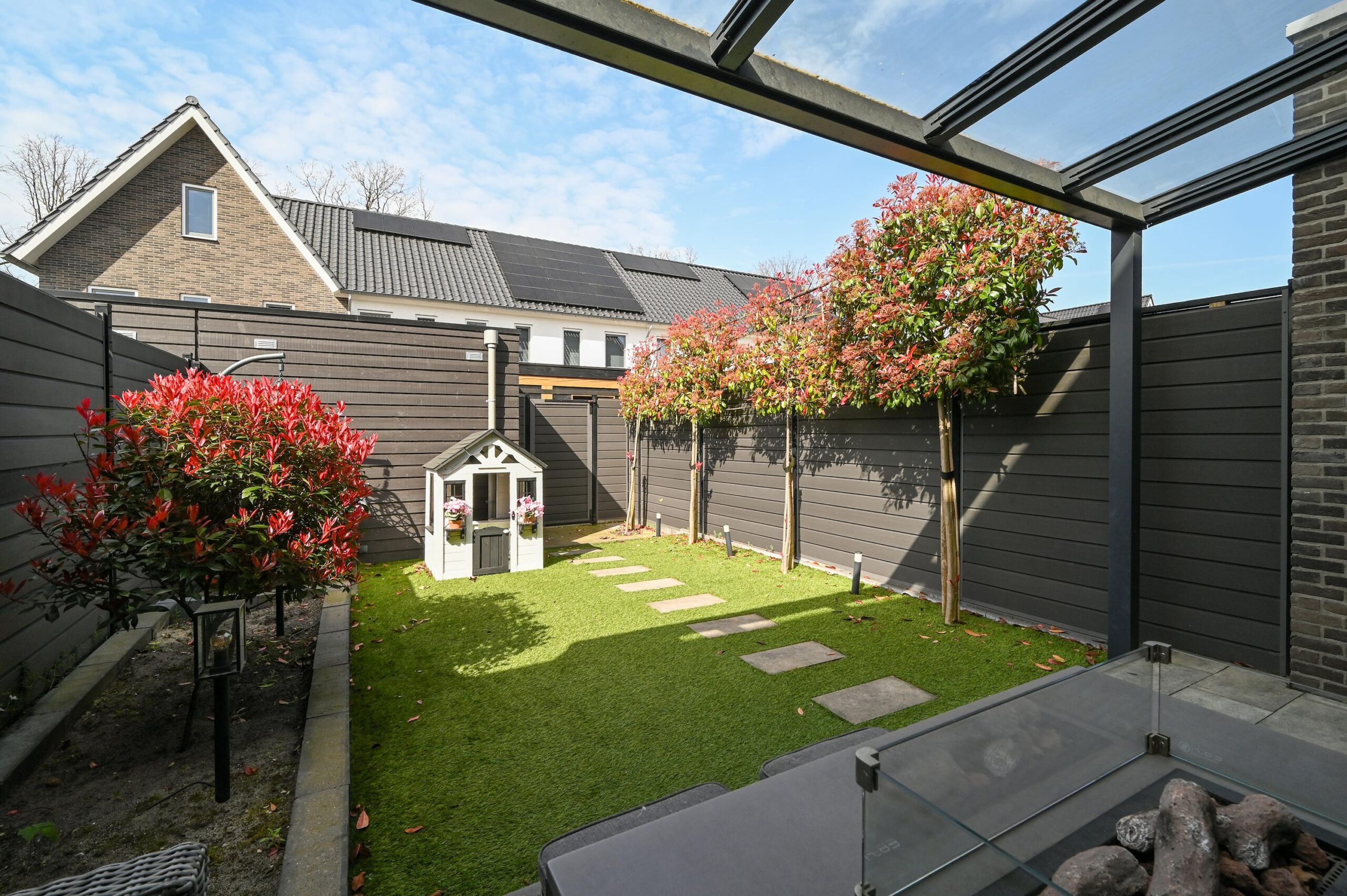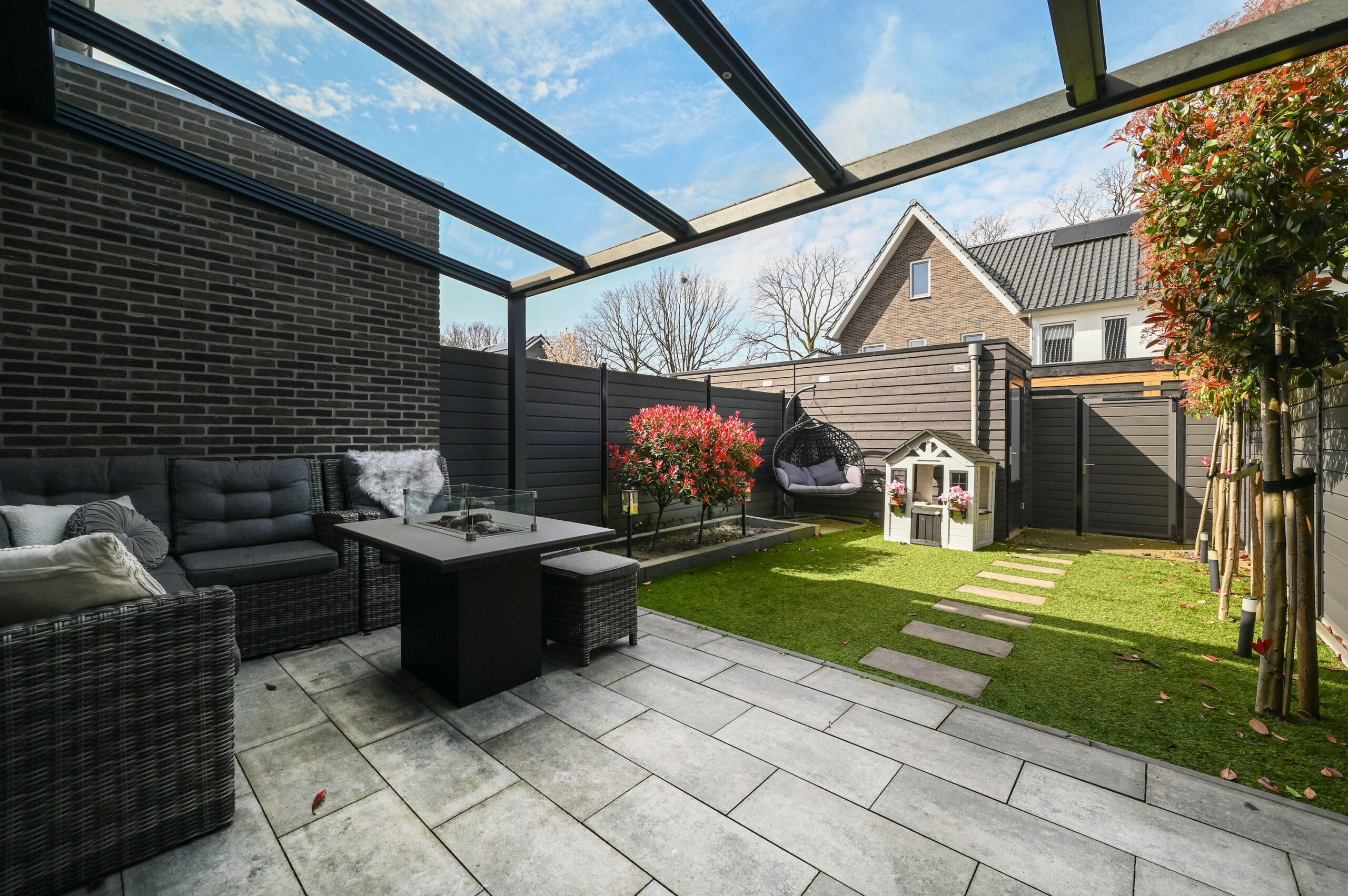 De achtertuin is op het westen gelegen en is stijlvol en verzorgd aangelegd. De tuin is onderhoudsvriendelijk en volledig omheind, met een praktische achterom. Over de gehele breedte van de woning bevindt zich een fraaie overkapping met glaspanelen en een geïntegreerd zonnescherm. Ieder paneel is afzonderlijk elektrisch bedienbaar, wat zorgt voor optimaal comfort en flexibiliteit.