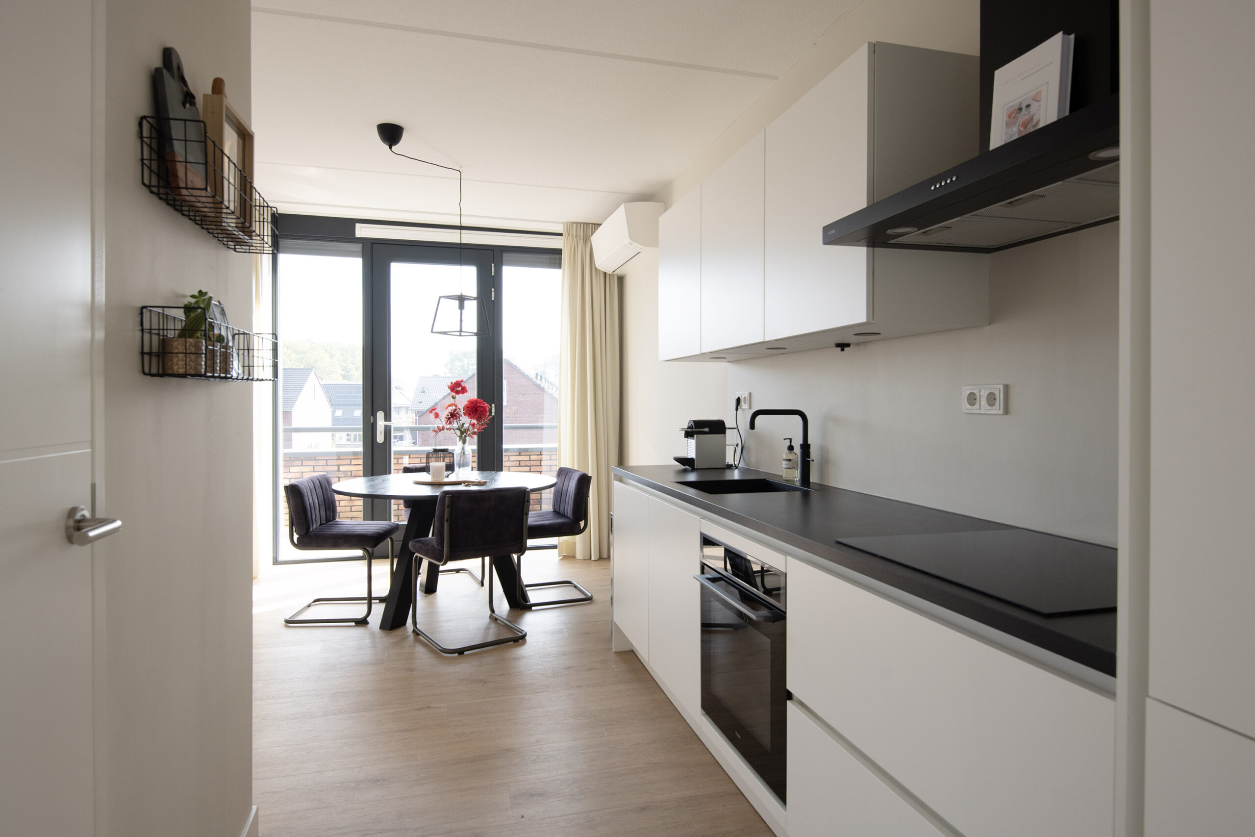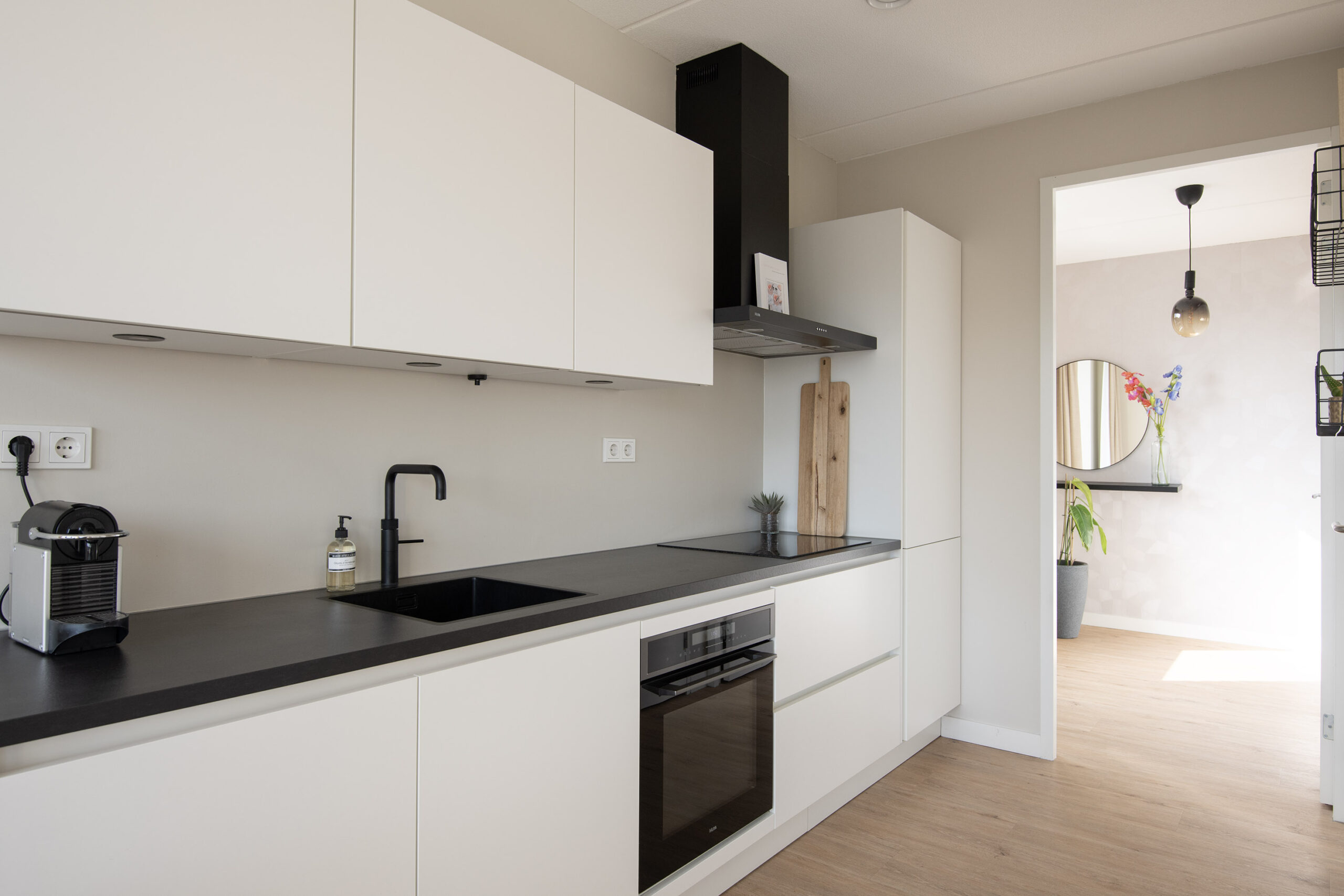 Vanuit de eethoek is er toegang tot het balkon, dat een prettig uitzicht biedt over de straat. Een fijne buitenruimte waar het aangenaam genieten is van een kop koffie in de ochtendzon of een ontspannen moment aan het einde van de dag. De luxueuze keuken is uitgevoerd in een frisse, lichte kleurstelling met stoere zwarte details, wat zorgt voor een eigentijdse stijlvolle uitstraling. De keuken is voorzien van moderne inbouwapparatuur, waaronder een inductiekookplaat, afzuigkap, Quooker, koel-vriescombinatie, vaatwasser en combimagnetron. Dankzij de onder- en bovenkasten is er ruim voldoende opbergruimte aanwezig, waardoor de keuken praktisch is ingedeeld.