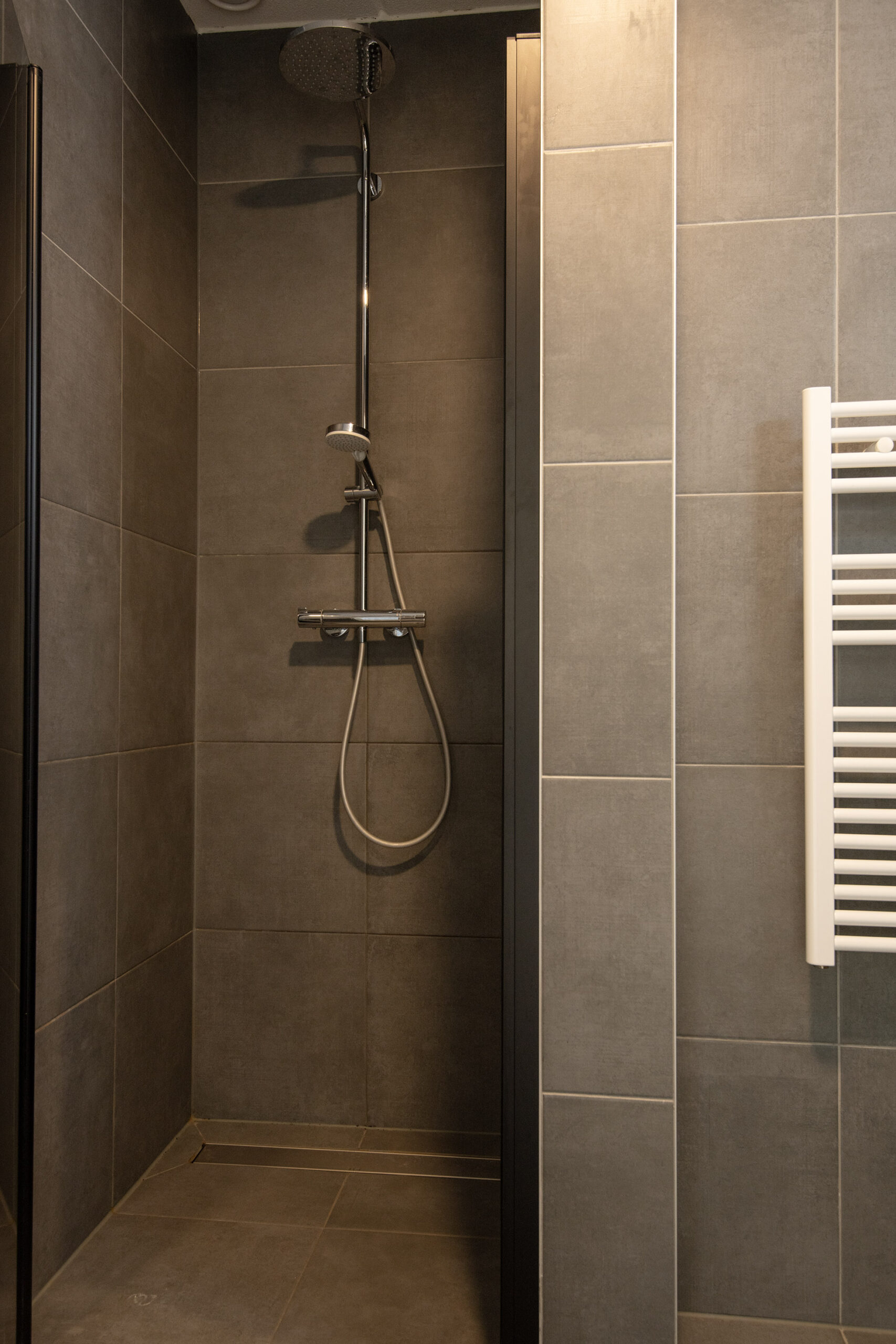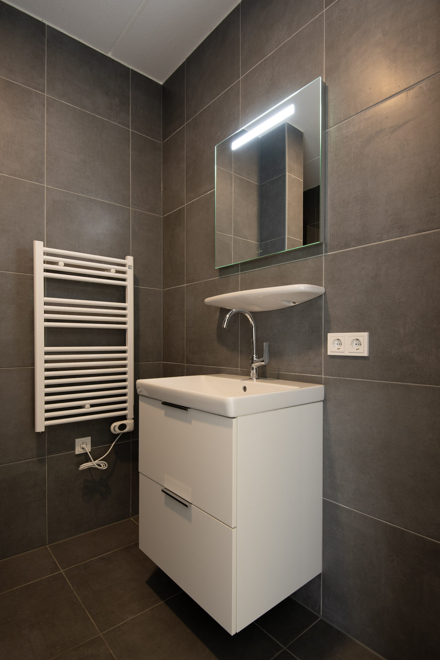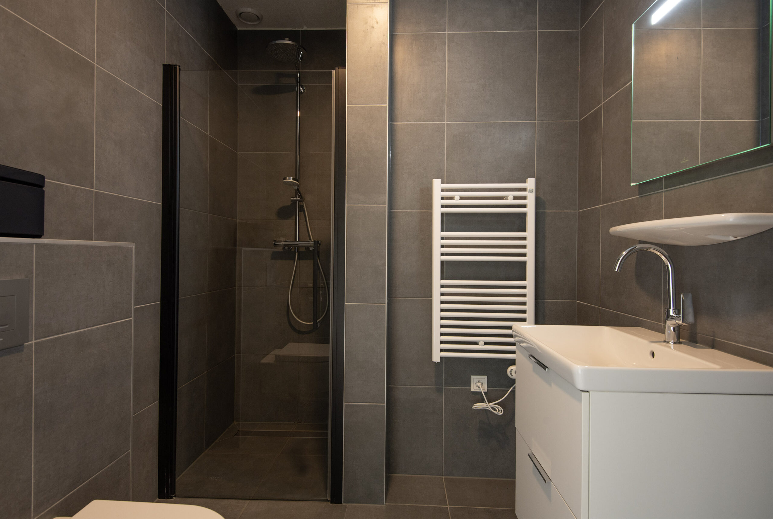 De 2 slaapkamers zijn ruim en praktisch van indeling met een rustige uitstraling. 1 van de 2 is momenteel in gebruik als inloopkast maar kan eenvoudig worden ingericht naar eigen wens. Beide kamers beschikken over comfortabele vloerverwarming, veel natuurlijk daglicht en sluiten naadloos aan bij de moderne stijl en afwerking. De badkamer is afgewerkt met donkere tegels en lichte meubels wat zorgt voor een fraai contrast en luxe uitstraling. De badkamer is ingedeeld met een vrijdragend toilet, inloopdouche met glazen wand, wastafel met meubel, spiegel en planchet en een design-radiator. De betegeling tot aan het plafond en de vloerverwarming dragen bij aan het comfort van deze ruimte.