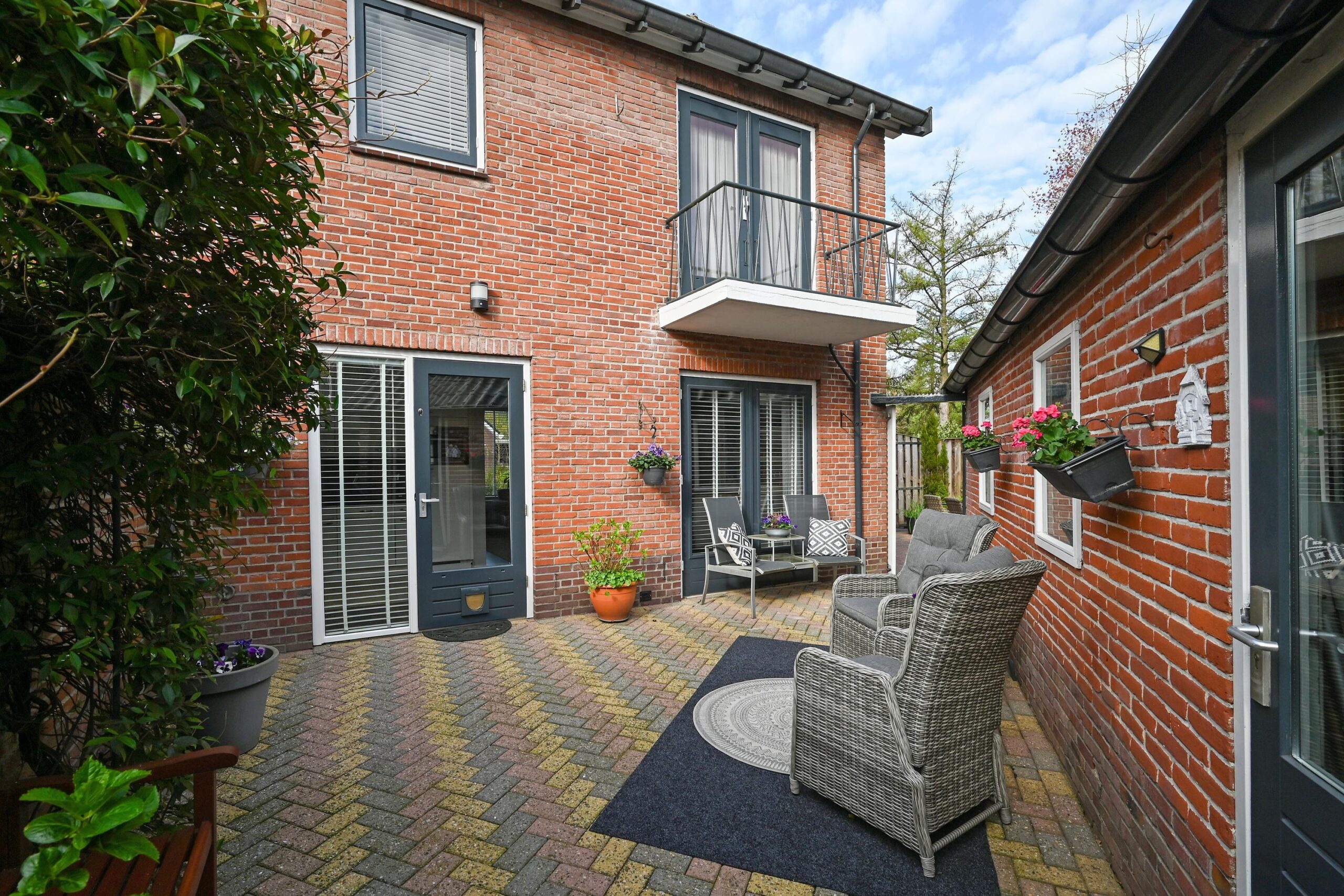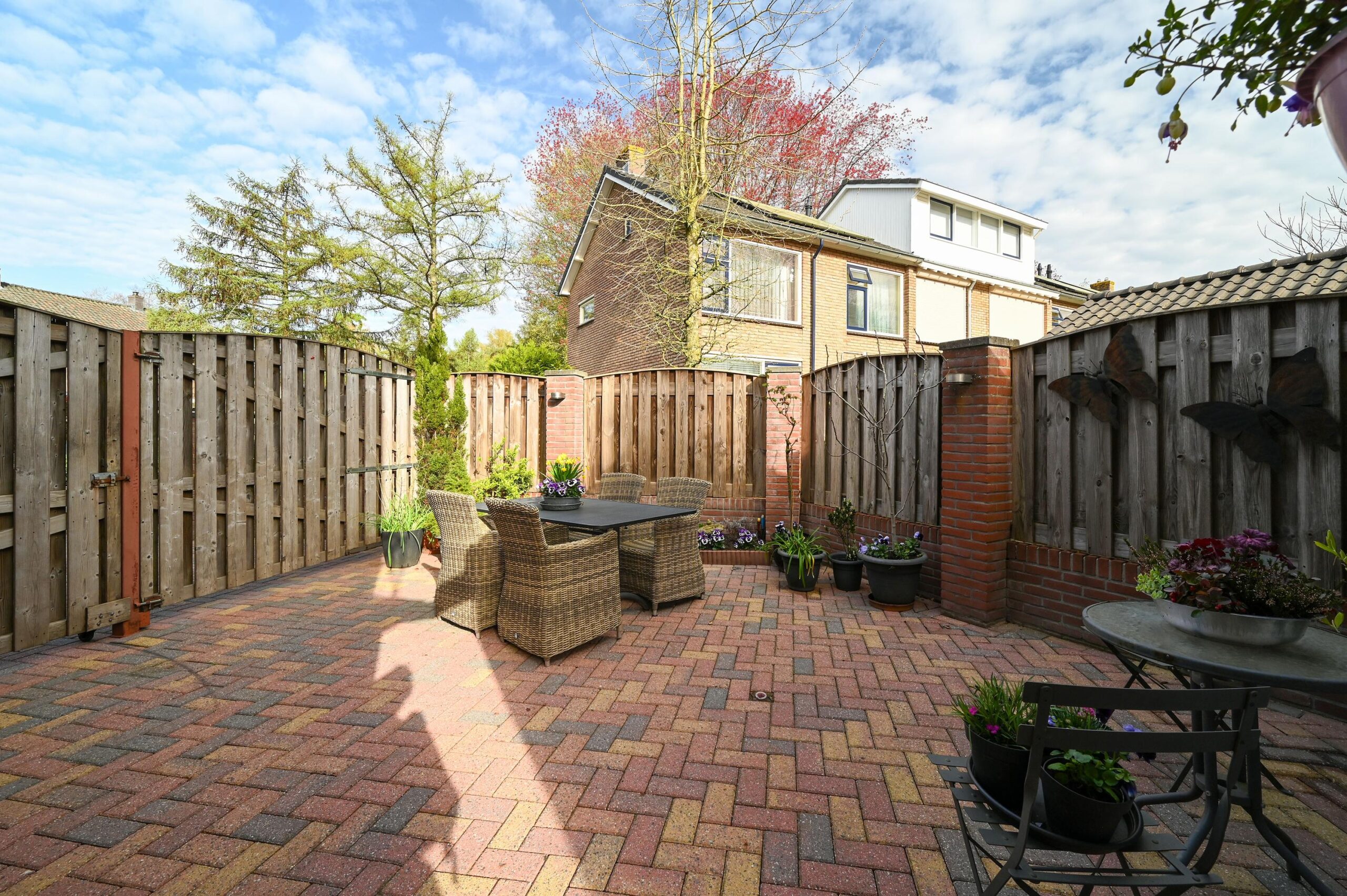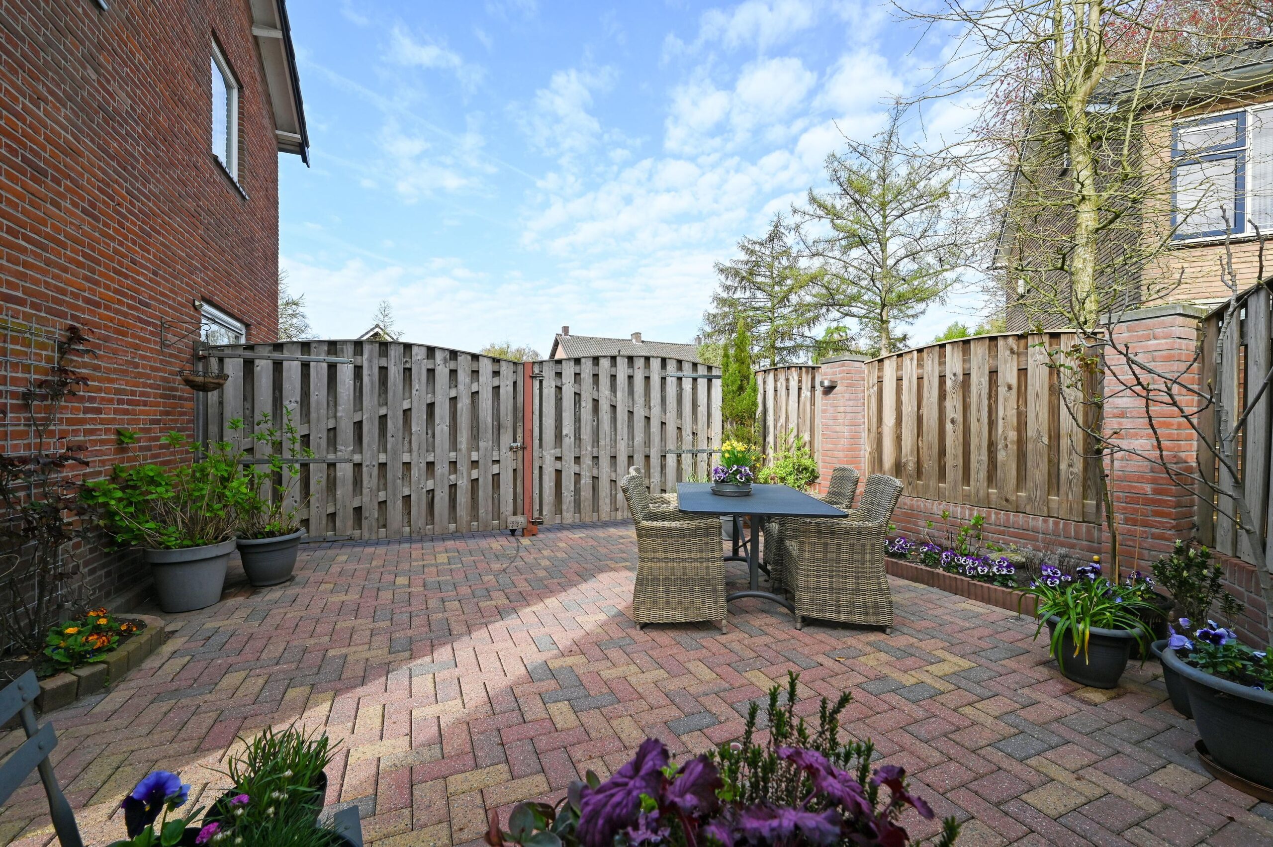 Via een poortdeur tussen de garage en de woning is het geheel omheinde, royale terras aan de zijkant van de woning bereikbaar. Dit terras is gunstig gelegen op het zuidwesten, waardoor hier volop van de middag- en avondzon genoten kan worden. De beschutte ligging maakt het een heerlijke plek om in alle rust buiten te zitten.