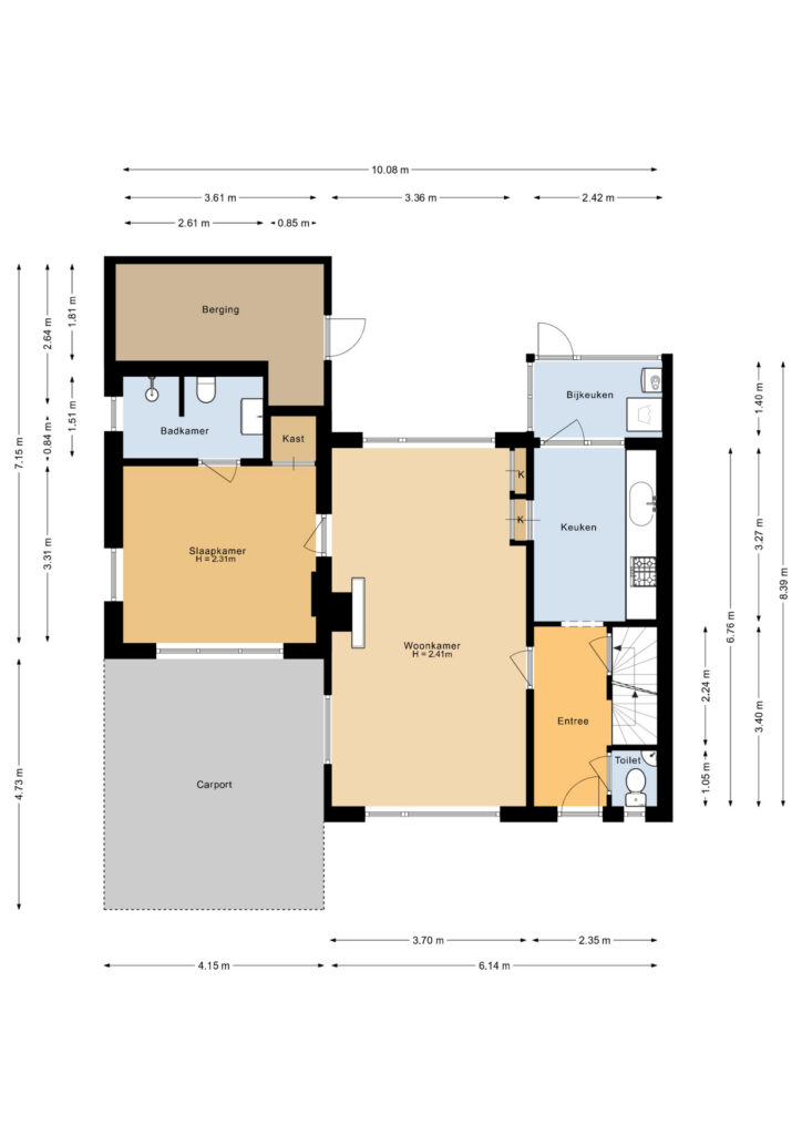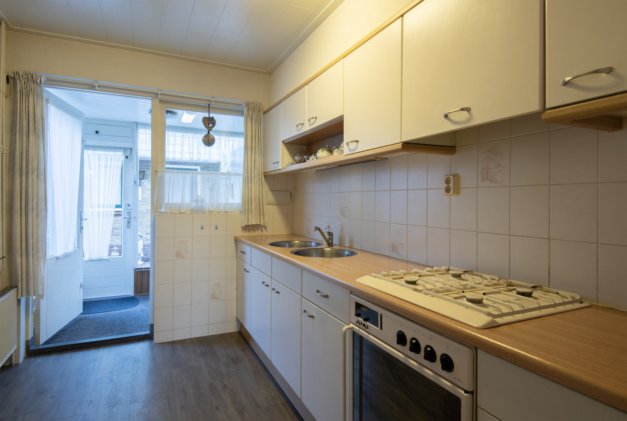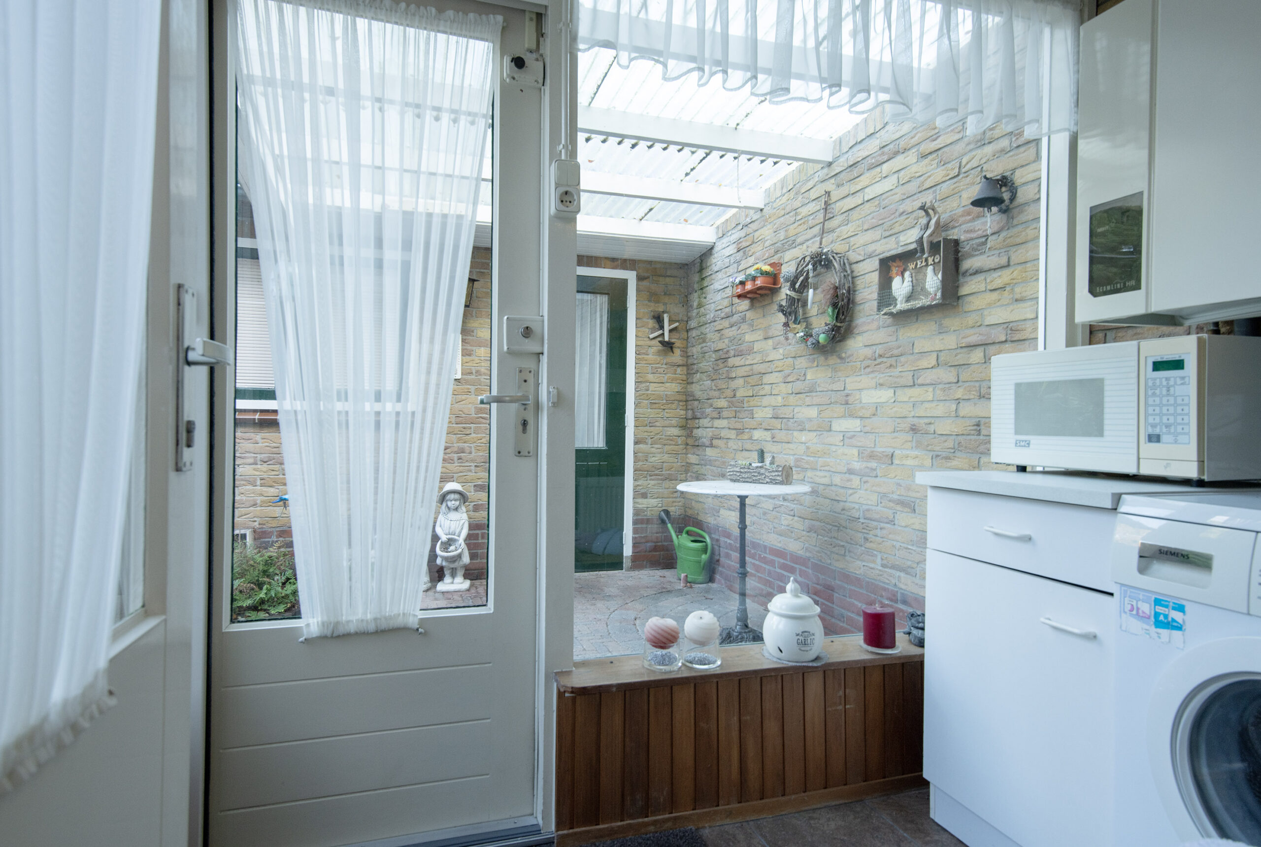 Aansluitend bevindt zich de bijkeuken met achterentree en aansluiting voor wasapparatuur en de cv-installatie.