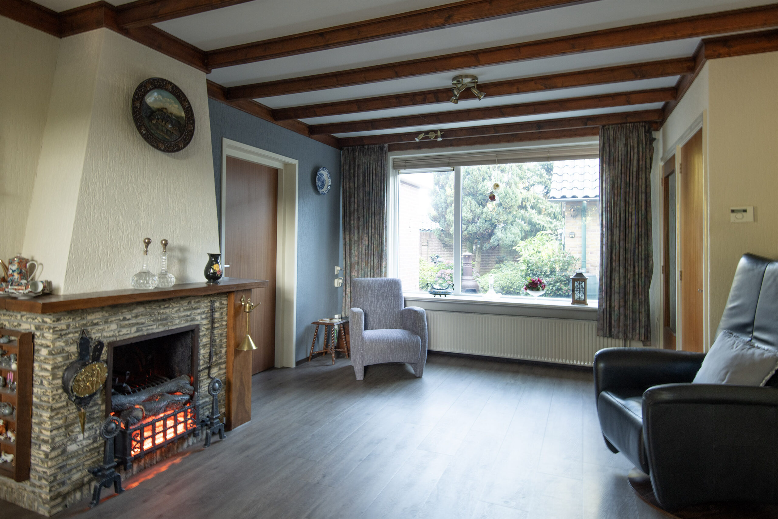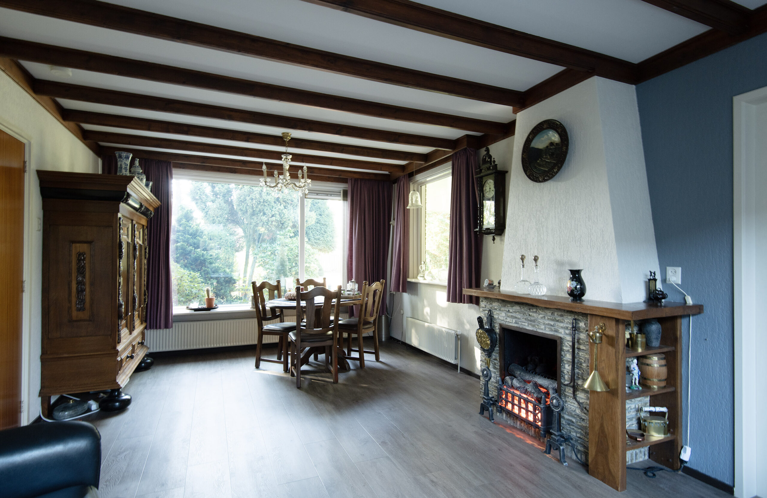 Begane grond: de sfeervolle doorzonwoonkamer heeft een prachtige lichtinval dankzij de grote ramen aan voor- en achterzijde en het zijraam. De ruimte heeft een warme uitstraling, mede door het balkenplafond en de elektrische sfeerhaard met klassieke schouw. Het aanwezige rookkanaal biedt bovendien de mogelijkheid voor het plaatsen van een houtkachel of een open haard. De woonkamer is verder voorzien van 2 vaste kasten, waarvan 1 servieskast en is afgewerkt met een ‘houtlook’ PVC-vloer, deze is doorgelegd over de gehele begane grond, wat zorgt voor rust en eenheid.