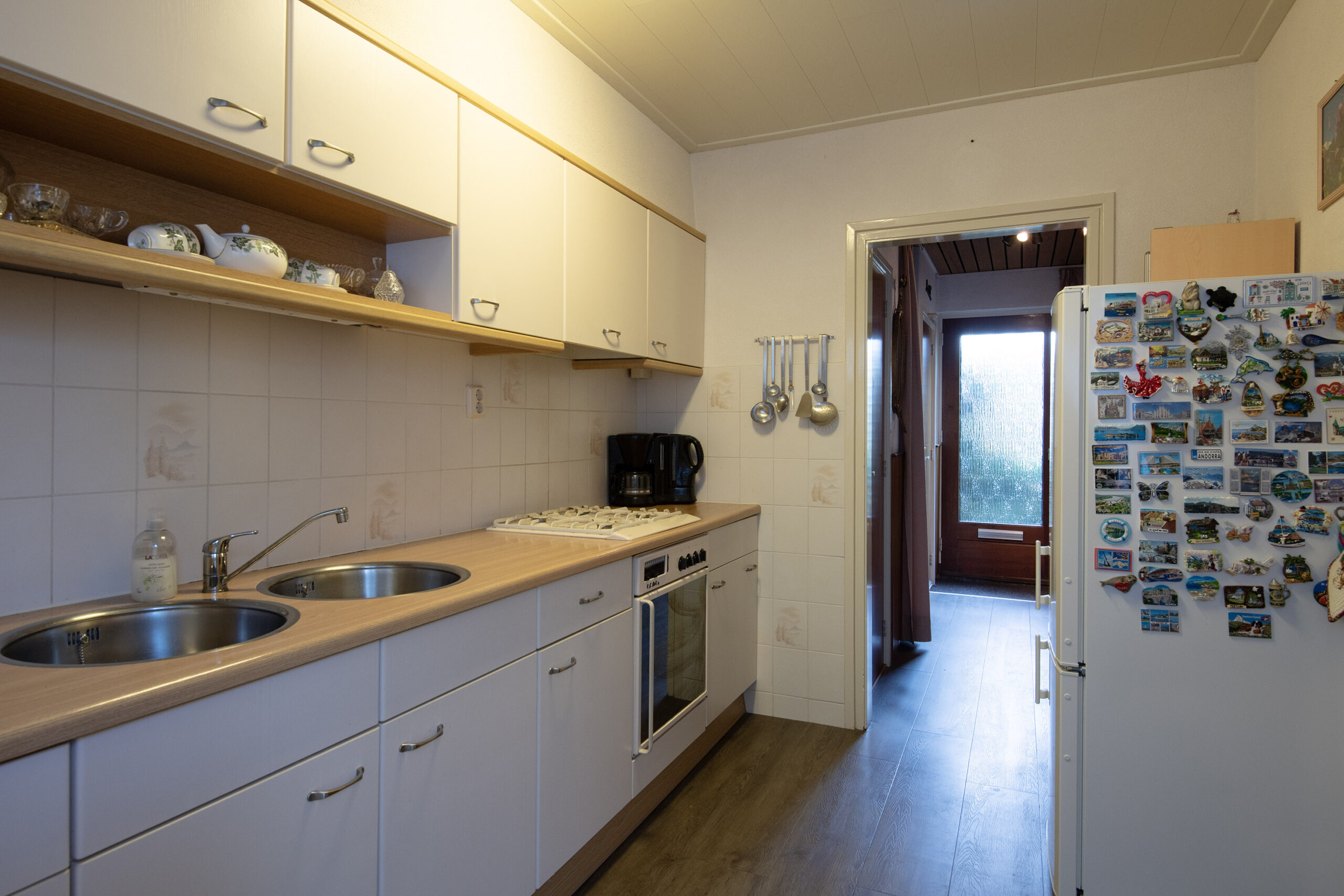 De keuken is uitgevoerd in een wand-opstelling met zowel boven- als onderkastjes waardoor er volop bergruimte is. Verder beschikt de keuken over een gaskookplaat, oven, afzuigkap en een dubbele spoelbak. Daarnaast is er een losse koel-/vries-combinatie aanwezig.