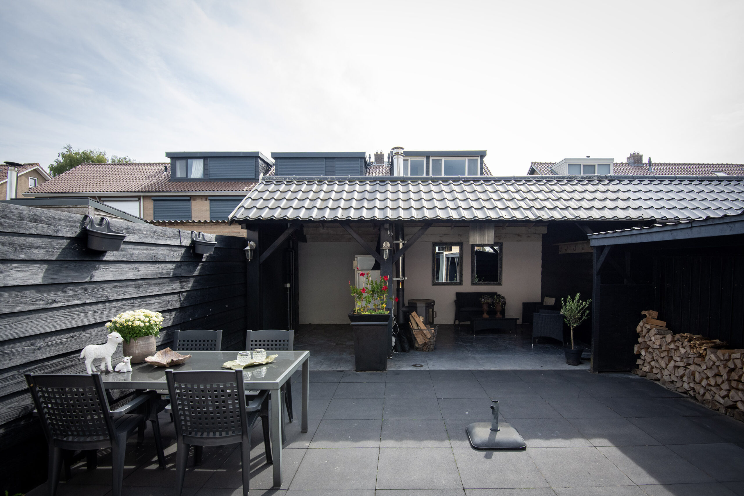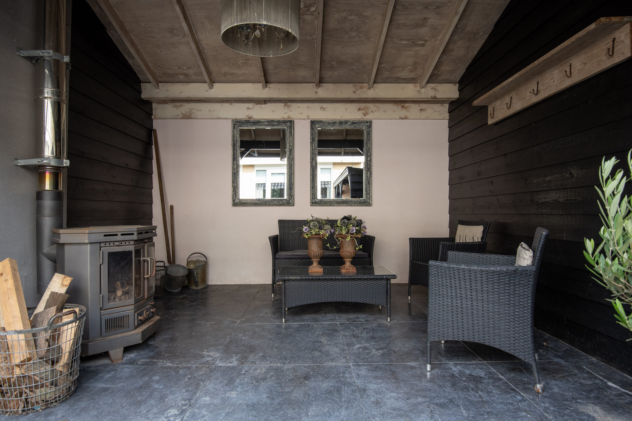 De veranda is voorzien van elektra en aansluiting voor een houtkachel. De open berging is ideaal voor bijvoorbeeld de fietsen, zeker omdat ook vanuit hier het perceel achterom toegankelijk is.