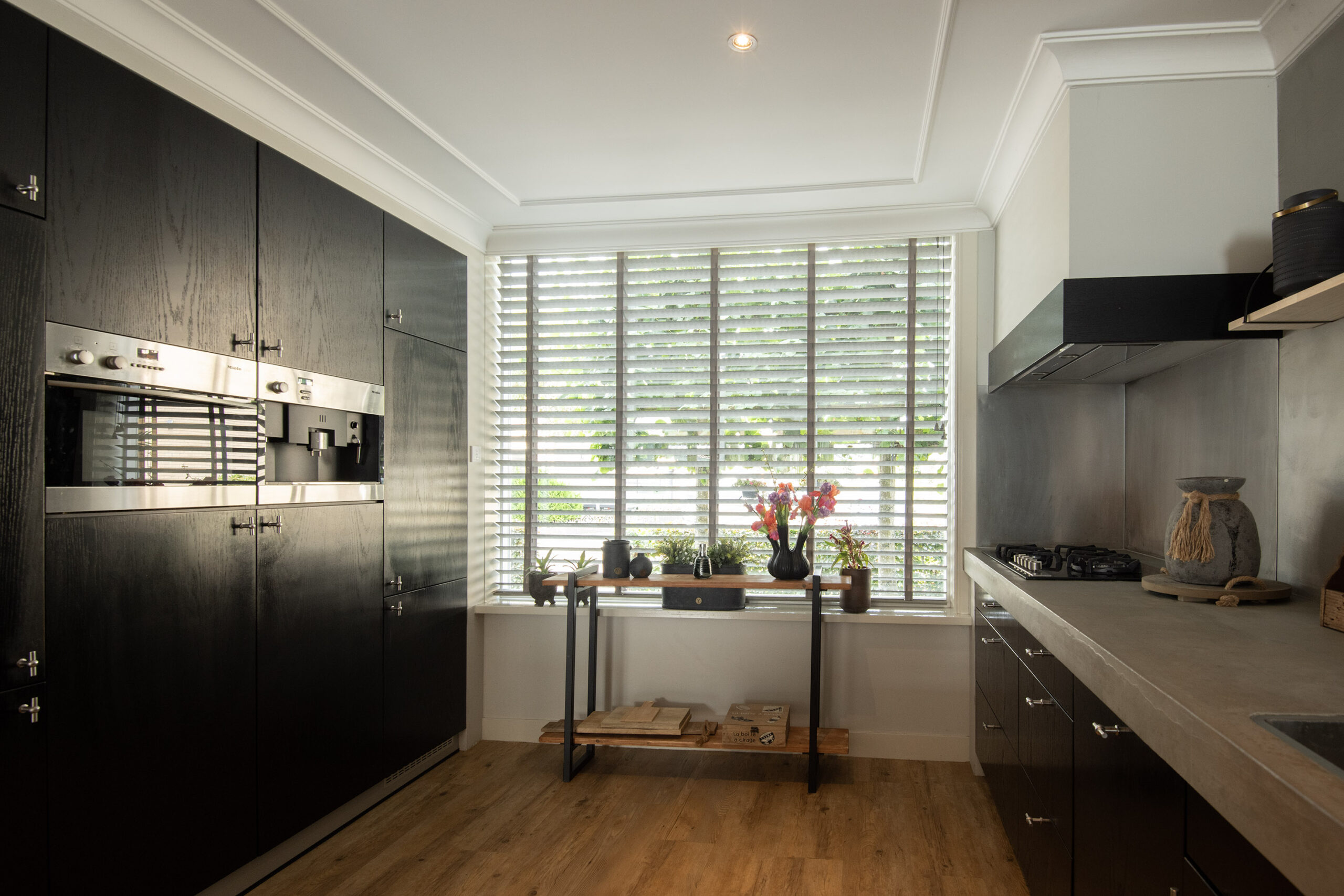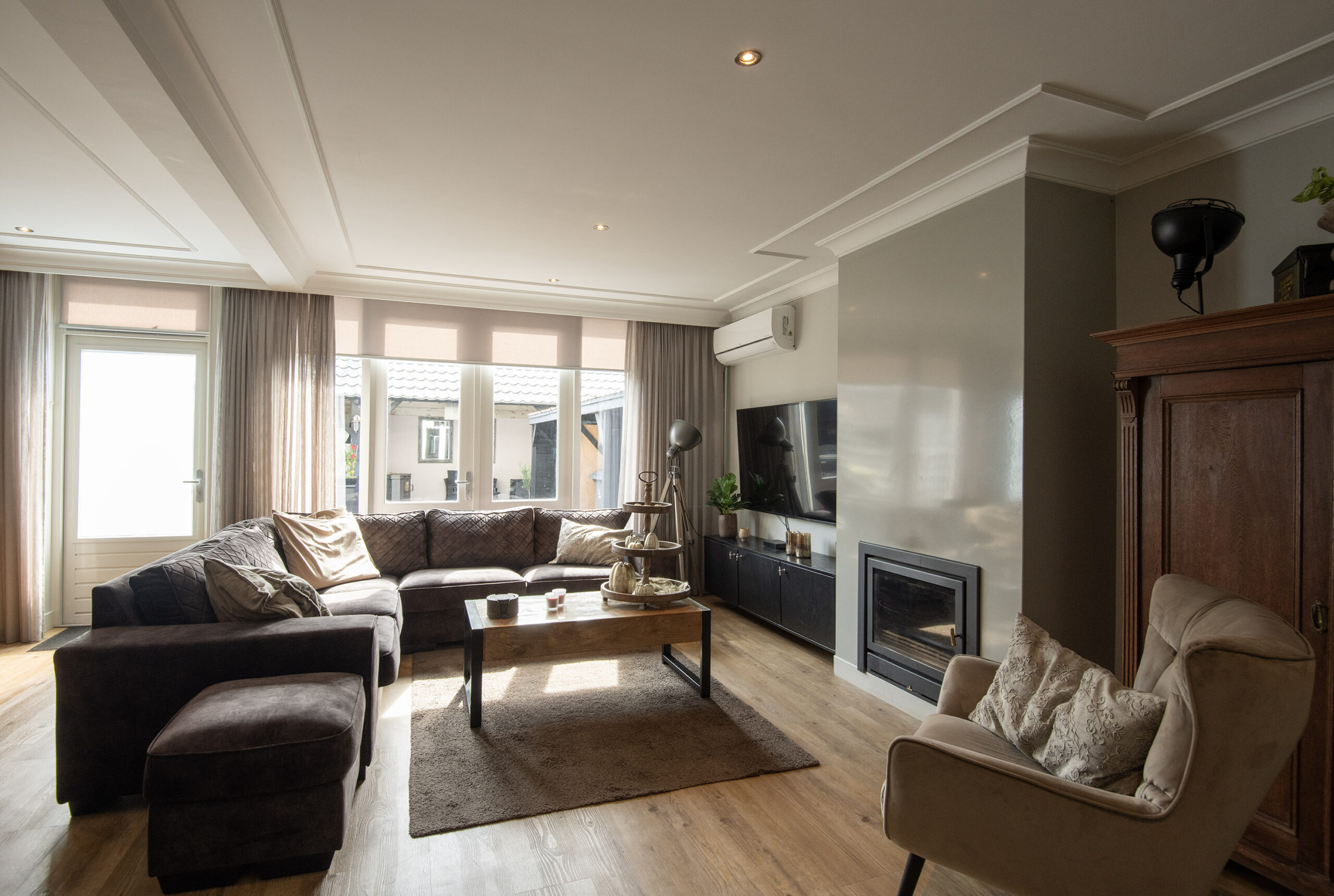 Begane grond: de moderne, lichte woon-/leefruimte is luxe afgewerkt met een fraai planfond voorzien van sierlijsten en inbouwspots. De ruimte is verder afgestyled met een pvc-vloer met vloerverwarming, wat zorgt voor comfortabele warmte. De stijlvolle houtkachel met schouw zorg voor de gezellige warmte tijdens de koude winteravonden, terwijl in de zomermaanden de airco zorgt voor de nodige verkoeling. Kortom hier is het ieder seizoen aangenaam. Tevens beschikt de woon-/leefruimte over openslaande deuren naar het terras en er is een trapkast aanwezig, ideaal om te gebruiken als bijvoorbeeld provisiekast. De prachtige op maat gemaakte keuken is aan de voorzijde gelegen en heeft een luxe stoere uitstraling. De keuken is afgewerkt met een betonnen aanrechtblad en beschikt over ruim voldoende bergruimte. Er is diverse inbouwapparatuur aanwezig, te weten: gaskookplaat, afzuigkap en een vaatwasser. In de stijlvolle bijbehorende kastenwand zijn de oven, 2 koel-/vries-combinaties en de koffiemachine geplaatst. Tevens is de aansluiting voor wasapparatuur, hier op fraaie wijze geïntegreerd.