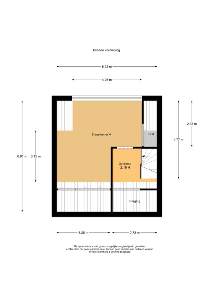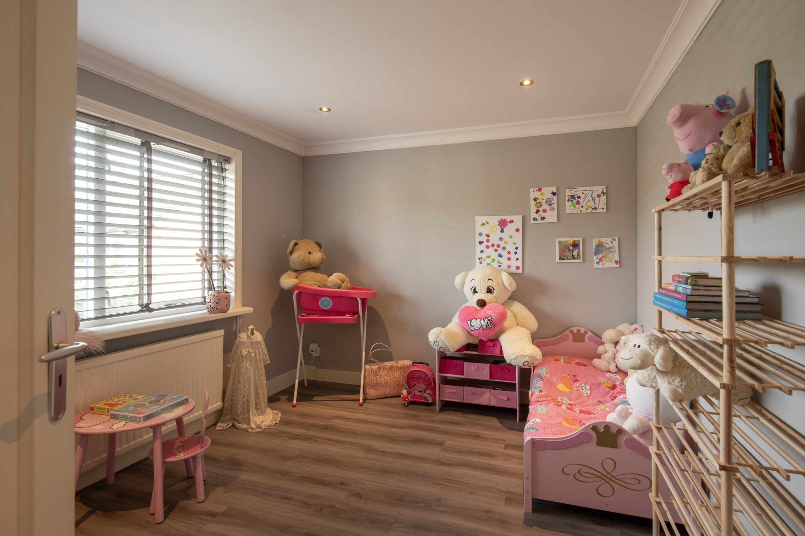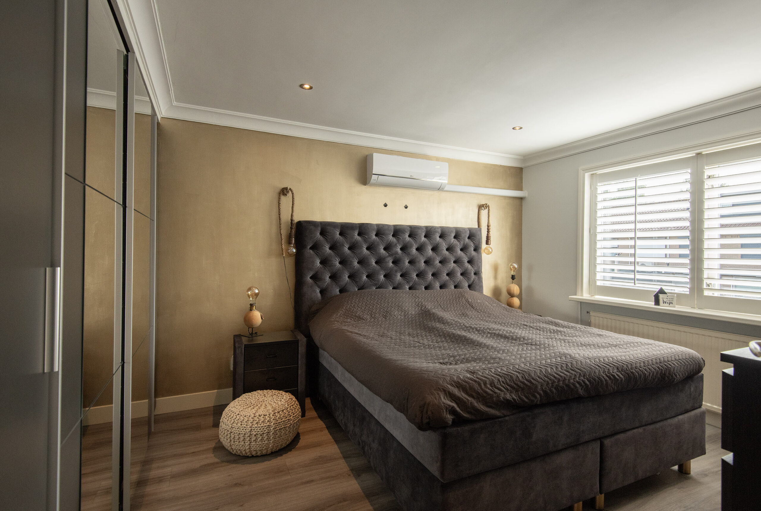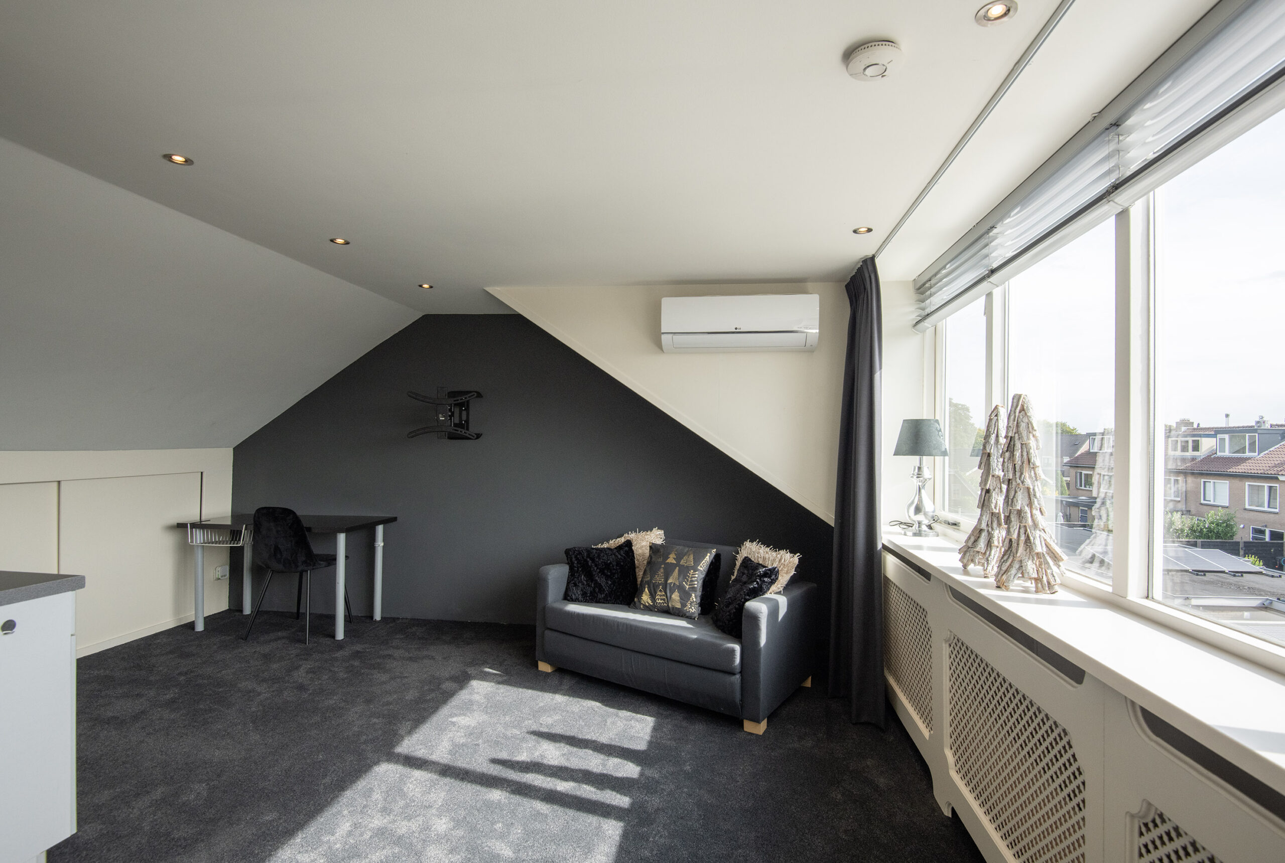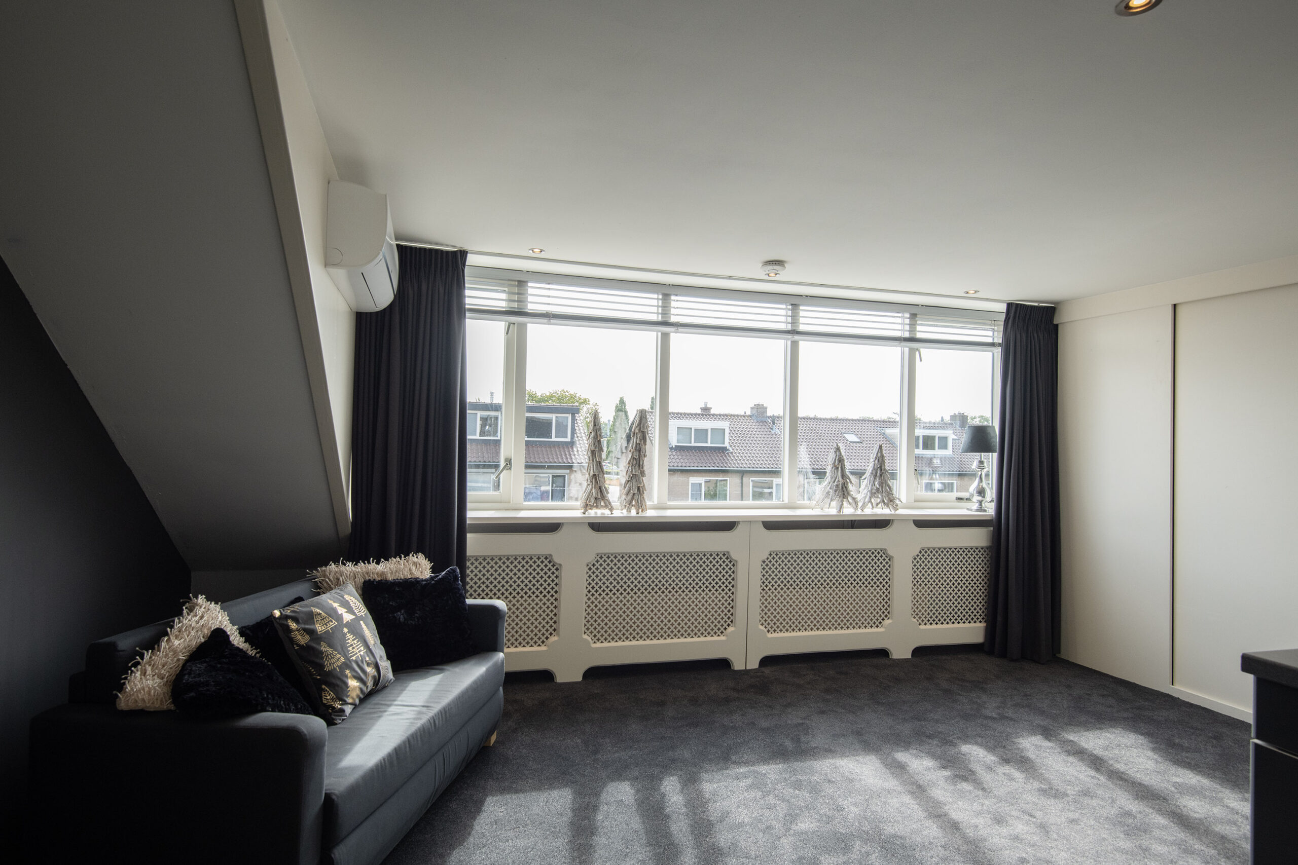 Via een vaste trap is de overloop met vaste praktische bergruimte bereikbaar. Via de overloop is er toegang tot de 4e slaapkamer welke is voorzien van een grote dakkapel en daardoor extra ruimte en licht biedt. Deze kamer is keurig afgewerkt met inbouwspots, vloerbedekking, radiatorombouw en ook hier is airco aanwezig voor optimaal comfort. Daarnaast is er veel handige vaste bergruimte gecreëerd onder de schuine kanten.