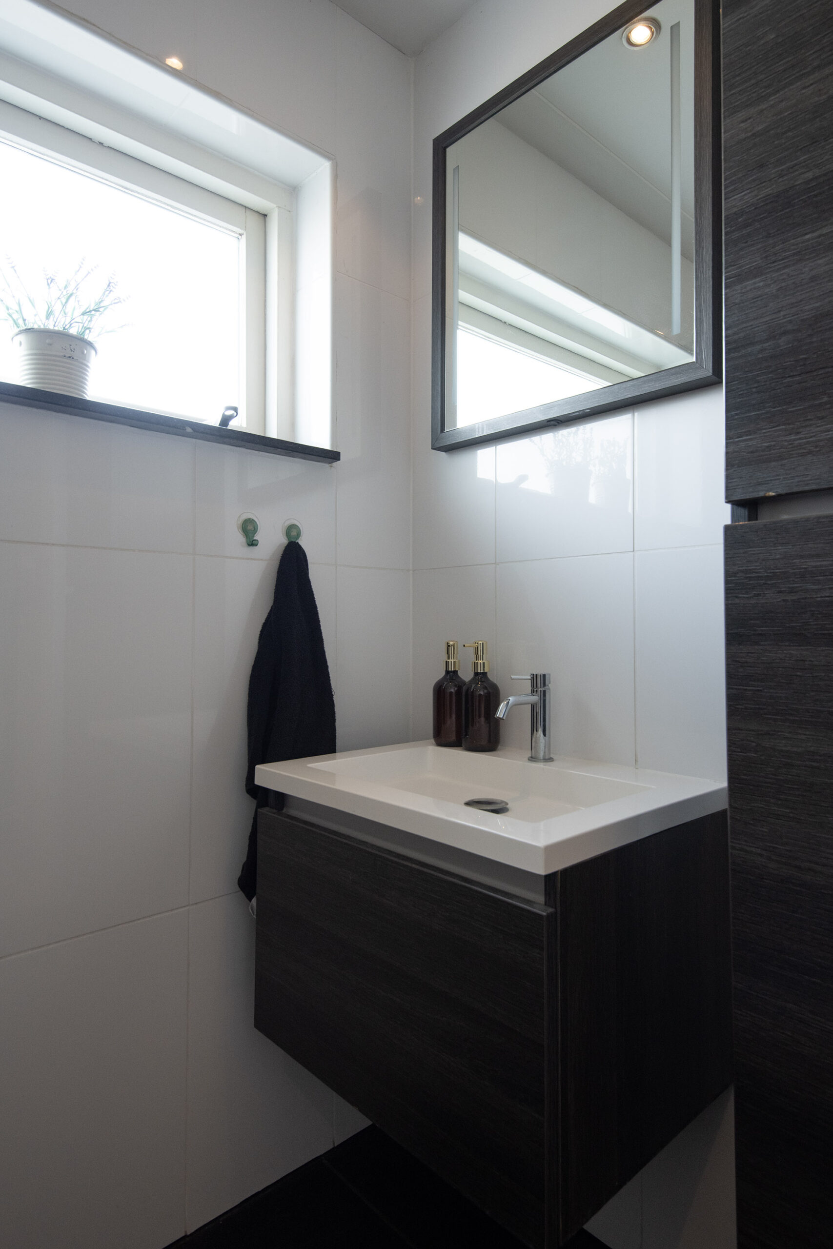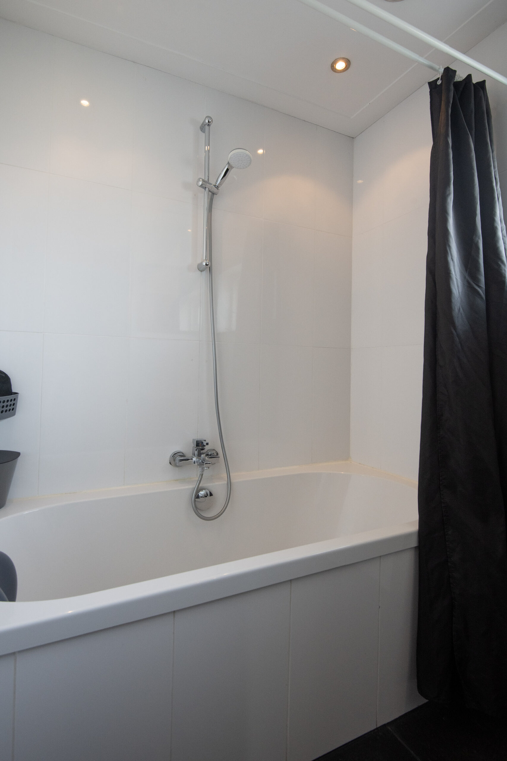 Ook hier hebben de plafonds sierlijsten en inbouwspots. De frisse, keurige badkamer is ingedeeld met een ligbad met douchevoorziening, modern wastafelmeubel en wandkast met praktische opbergruimte voor bijvoorbeeld de handdoeken.