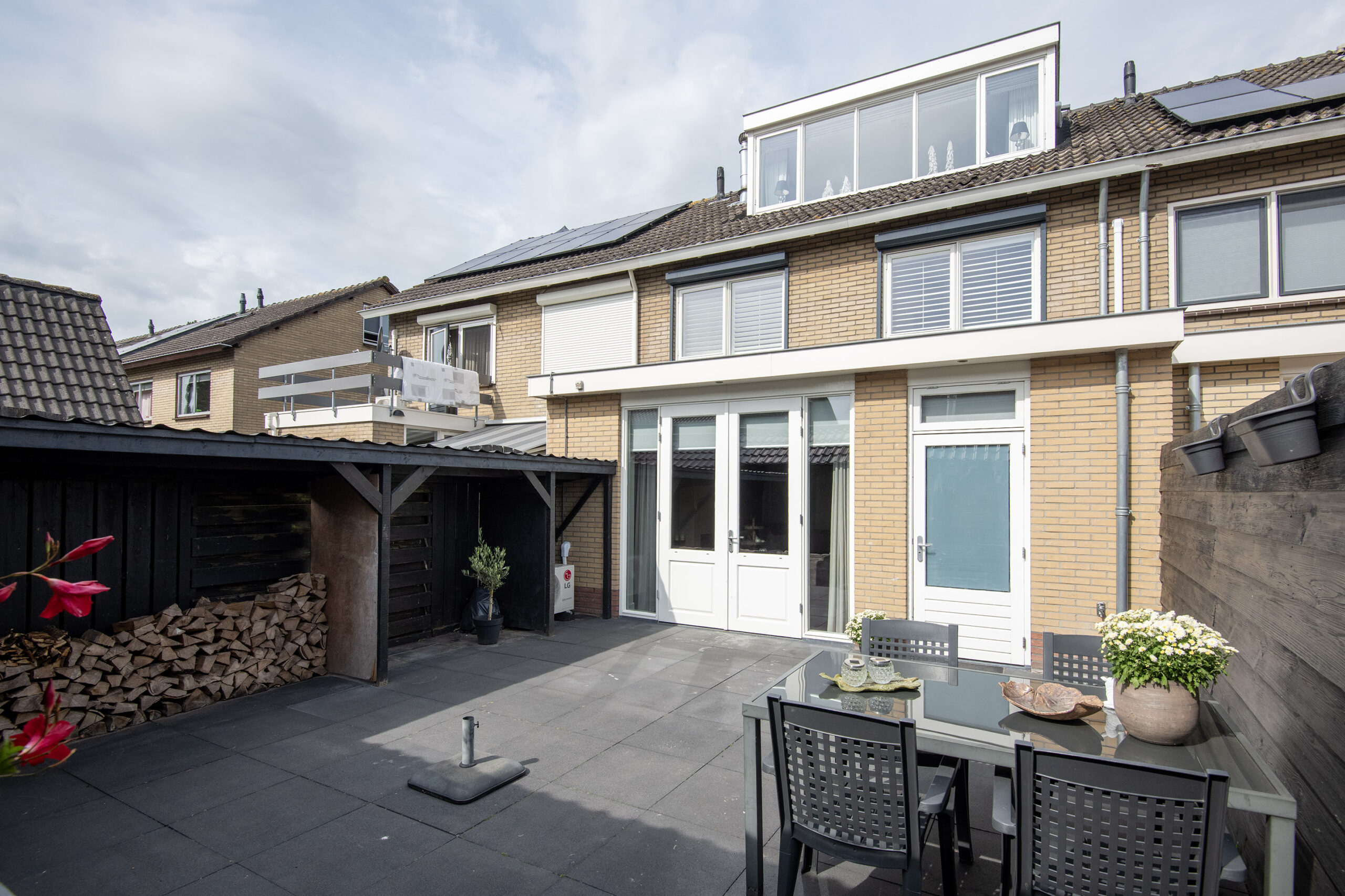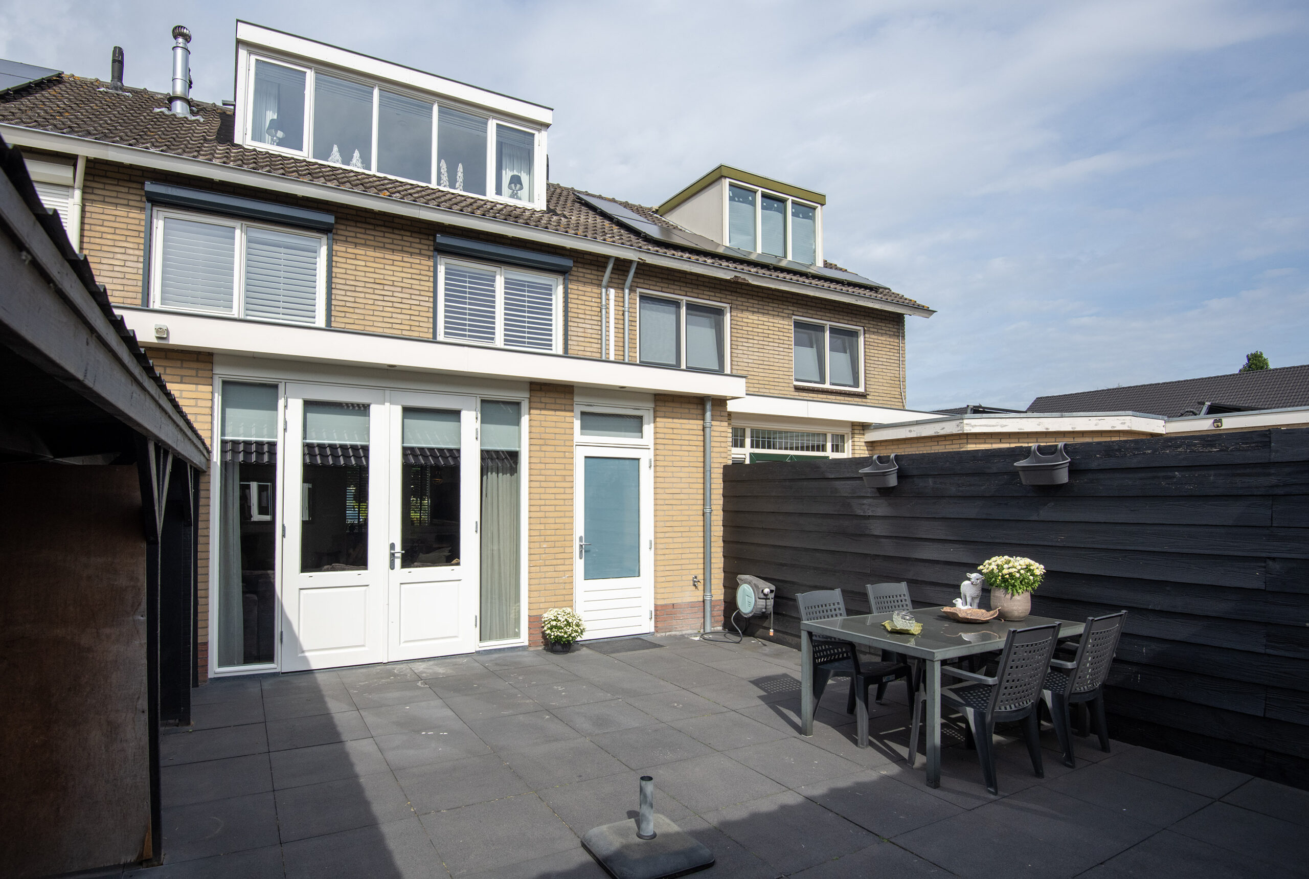 De verzorgde achtertuin heeft een gunstige zonligging, is geheel betegeld en ingericht met een fraai houthok. Achter in de tuin is over de gehele breedte een gezellige veranda met aansluitende open berging geplaatst.