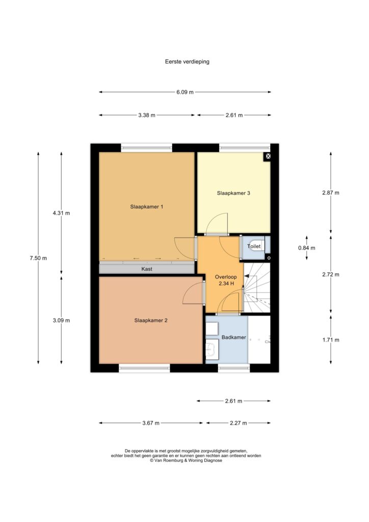 De 1e verdieping is ingedeeld met 3 slaapkamers, een comfortabele, frisse badkamer en een separaat toilet.
